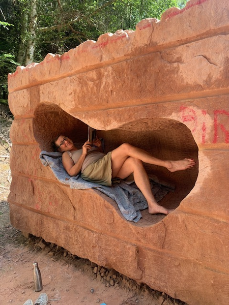 In einen ca. 200 x 150 x 300 cm großen Sandsteinblock ist von der Längsseite her eine kokonartige Höhlung hineingearbeitet. Der Stein öffnet sich so tief, dass zwei Personen gegenüber in dem Stein verweilen können, innehalten, ihn von innen belauschen, berühren, riechen, selbst zur Ruhe kommen, sich öffnen und vielleicht miteinander ins Gespräch kommen. Eine multisensorische Beziehung zum Stein wird möglich.
