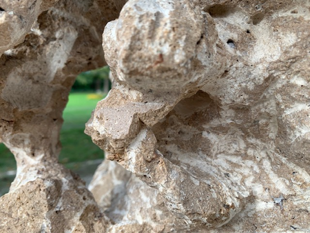 Auch Travertin ist ein Sedimentgestein, dessen Hohlräume und Kavernen Kapseln und Träger uralten Lebens sind. Was passiert, wenn ich diese Kapseln öffne und sie der Natur und der Witterung preisgebe? Wie wird er von der Flora und Fauna eingegliedert in den Kreislauf allen Lebendigen? Was passiert in den neuentstandenen „Schutzräumen“? Wie reagieren die Menschen darauf?