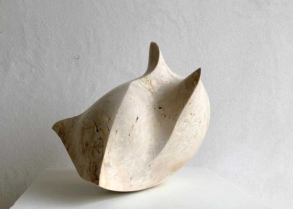 Die Skulptur "ohne Weiteres (abheben)" aus Kelheimer Auerkalk handelt von Balance und Leichtigkeit. Die Skulptur steht auf einem kleinen Punkt und ist sehr leicht beweglich. Das gibt ihr  den ganz spielerischen Moment und sie lässt sich leicht mit einer Hand in verschiedene Positionen bewegen. In der Bewegung wird auch spürbar, wie nah sie dem Moment des abhebens ist.