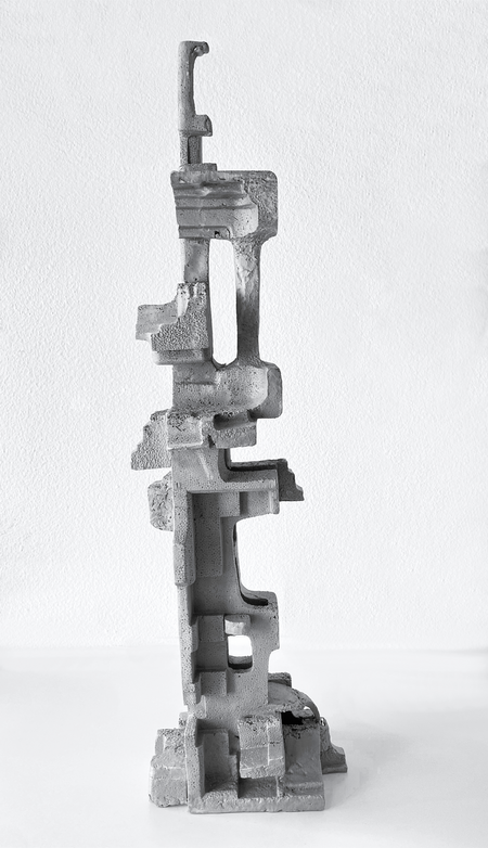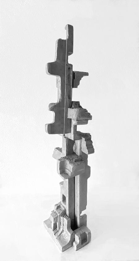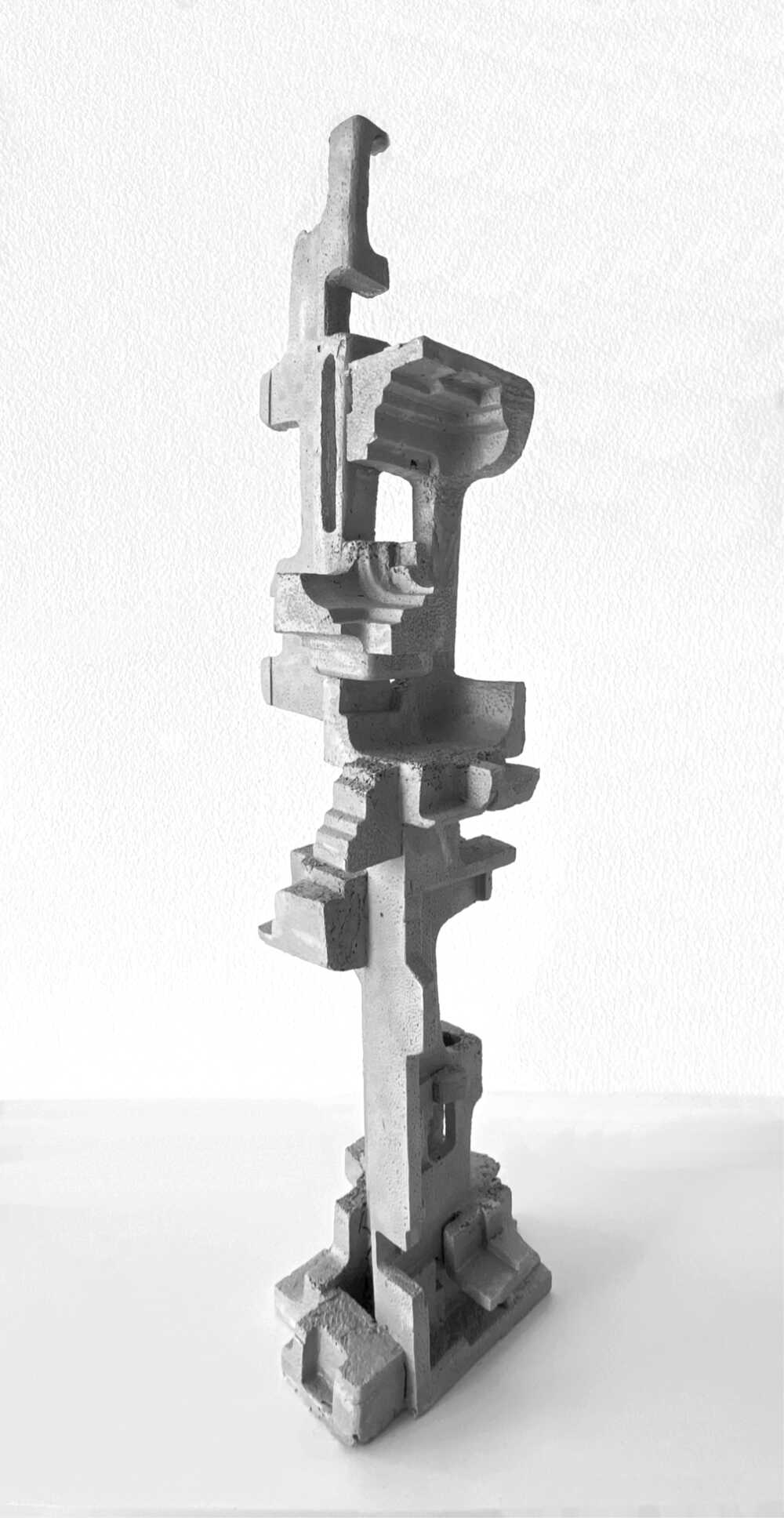 Eine abstrakte Aluminium-Skulptur, die in traumähnlicher Erscheinung vieler Interpretationen offen lässt. Von Treppen, die ins Nirgendwo führen, erodierten Ecken und gealterten Materialien, wie man sie von alten Betonhäusern kennt. Es gibt auf alle Fälle viel zu entdecken.