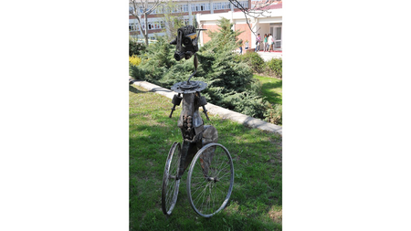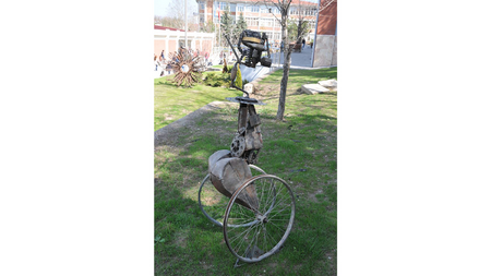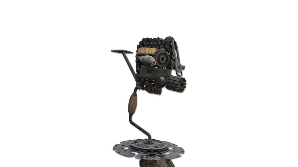 The use of waste metals emphasizes the importance of sustainability and recycling, while the design of the sculpture symbolizes the belief in the advancement of women in business and life. Feet with wheels represent movement and speed, symbolizing the ability to overcome any obstacle. Shaped with an abstract figurative approach. Spirit  of movement has an elegant exterior despite the  hardness and durability of metal.