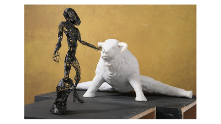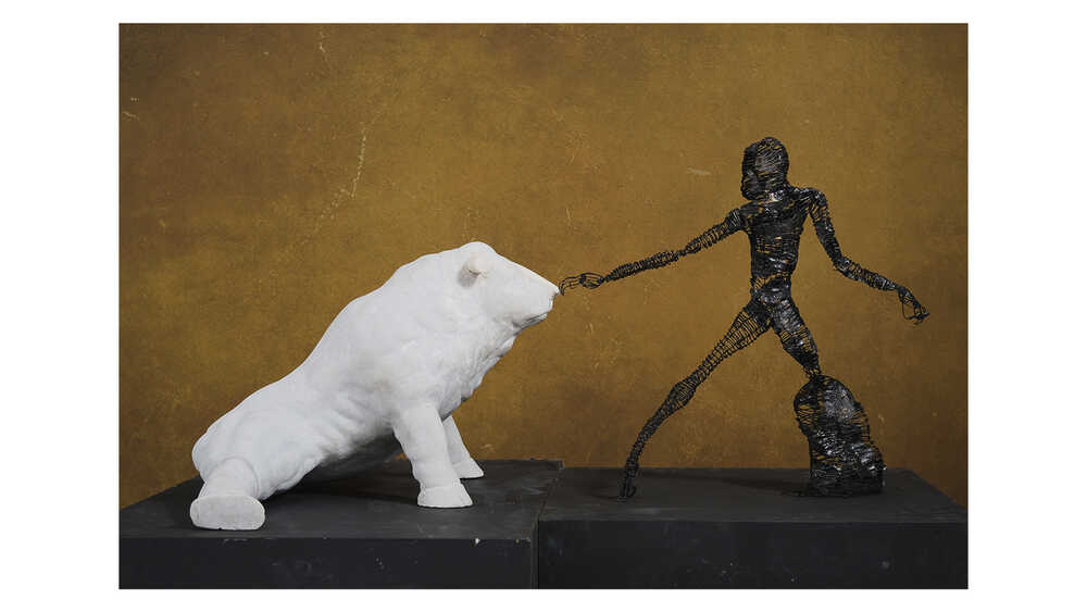 In the Epic of Gilgamesh, gods create Enkidu, but his animalistic traits prevail. To reveal his humanity, a woman is tasked and succeeds. Today, I notice parallels in the union of man and woman, emphasizing the man's animalistic nature and the woman's ability to temper it. Titled "Metamorphosis," my composition employs metaphors and materials to depict two contrasting elements, illustrating the convergence of male and female energies.