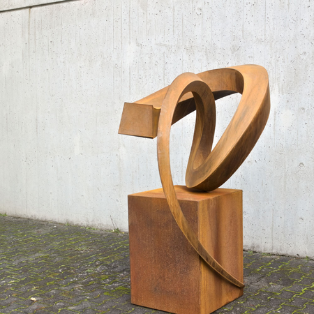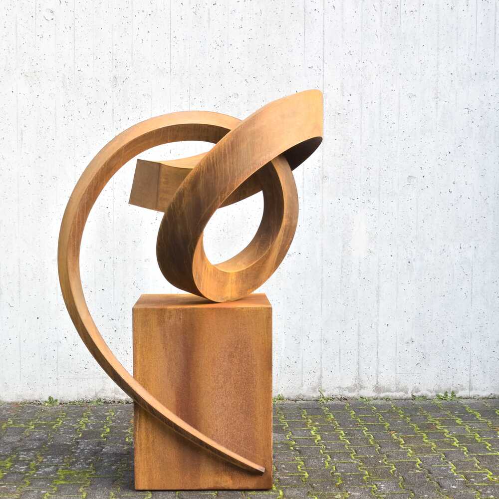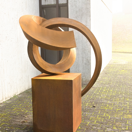 Eine Linie bildet den Ursprung der Skulptur „681 Grad“. Die in sich verschlungene Form steht für filigrane Leichtigkeit, der jedoch das Eigengewicht des Stahls diametral entgegensteht. Neben den eng beieinander verlaufenden Bögen wird die Skulptur durch schwungvolle Radien und sanfte Verdrehungen gebildet. Sehr edel wirkt die oxidierte Oberfläche der im Innen- als auch im Außenbereich positionierbaren Skulptur.
