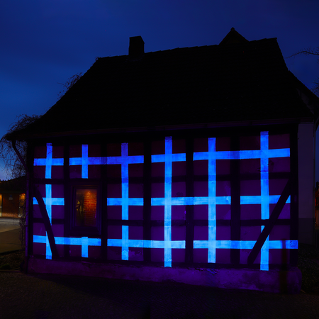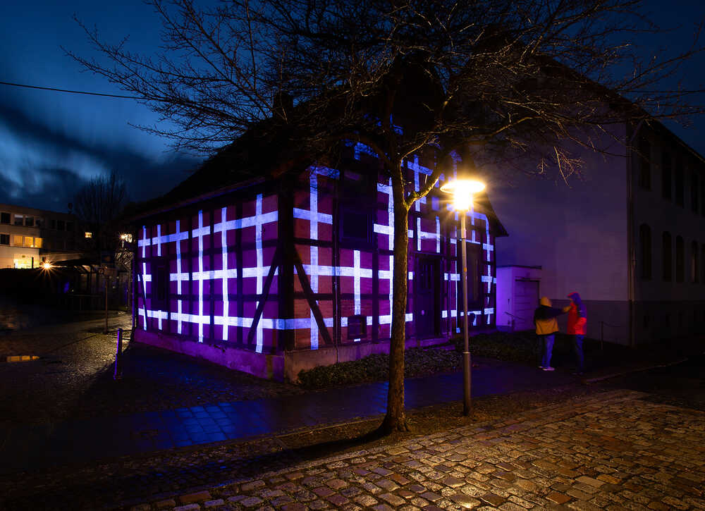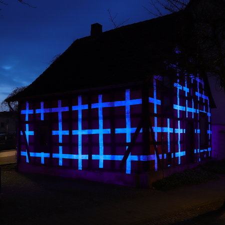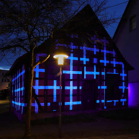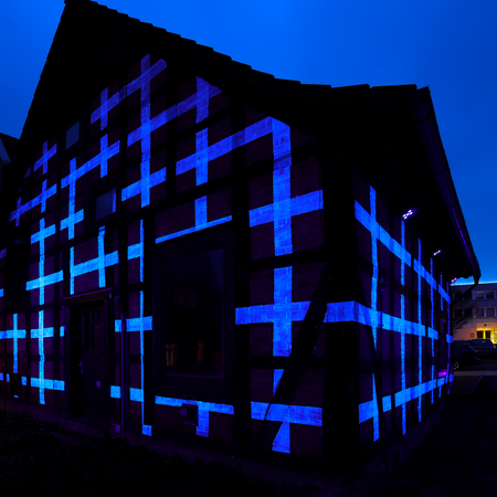 Das kleine Flechtwerkhaus ist eine Lichtinstallation, die mit der Struktur eines alten Fachwerkhauses der Kleinstadt Gehrden bei Hannover arbeitet. Die formale Struktur des Fachwerks, wurde hierbei mit UV-empfindlicher Farbe gedoppelt. Die tagsüber weißlich schimmernden Streifen haben die Breite des Fachwerks und beginnen unter der Bestrahlung mit UV-Licht zu leuchten. Der Anstrich wurde so vorgenommen, dass das gemalte Fachwerk mal vor und mal hinter dem echten Fachwerk zu liegen scheint. Es entsteht der Eindruck eines Geflechts.