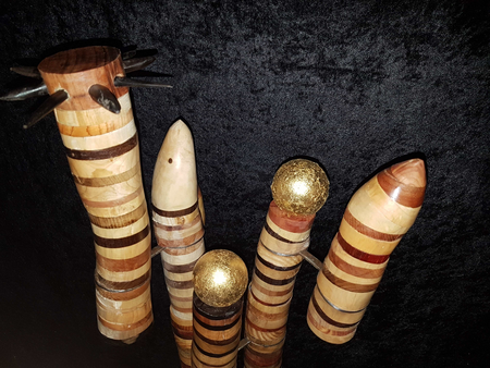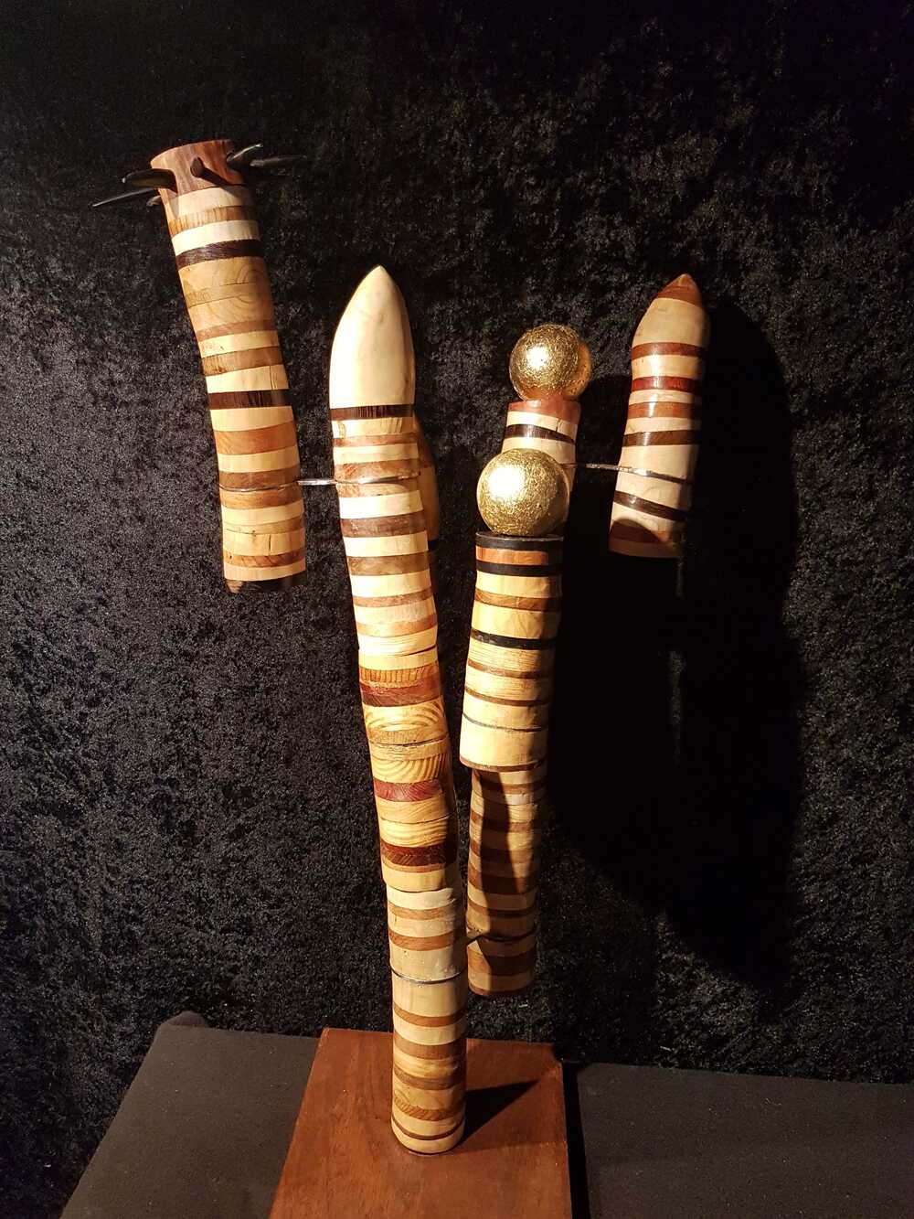 Mehrere Säulen sind aus diversen Hölzern (Heimische Hölzer, Tropenhölzer) gefertigt und werden über Stahlelemente miteinander drehbar verbunden. So können die Säulen beliebig gegeneinander bewegt und arrangiert werden. Die Hölzer sind glatt poliert, Holzkugen an der Spitze sind mit Schlagmetall verkleidet.