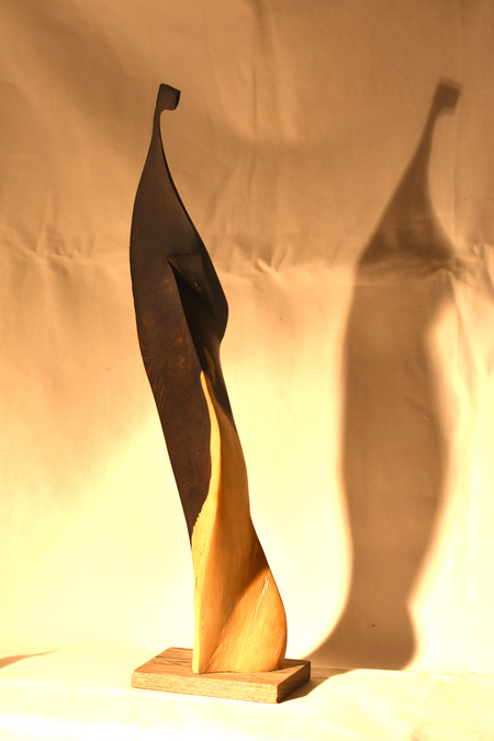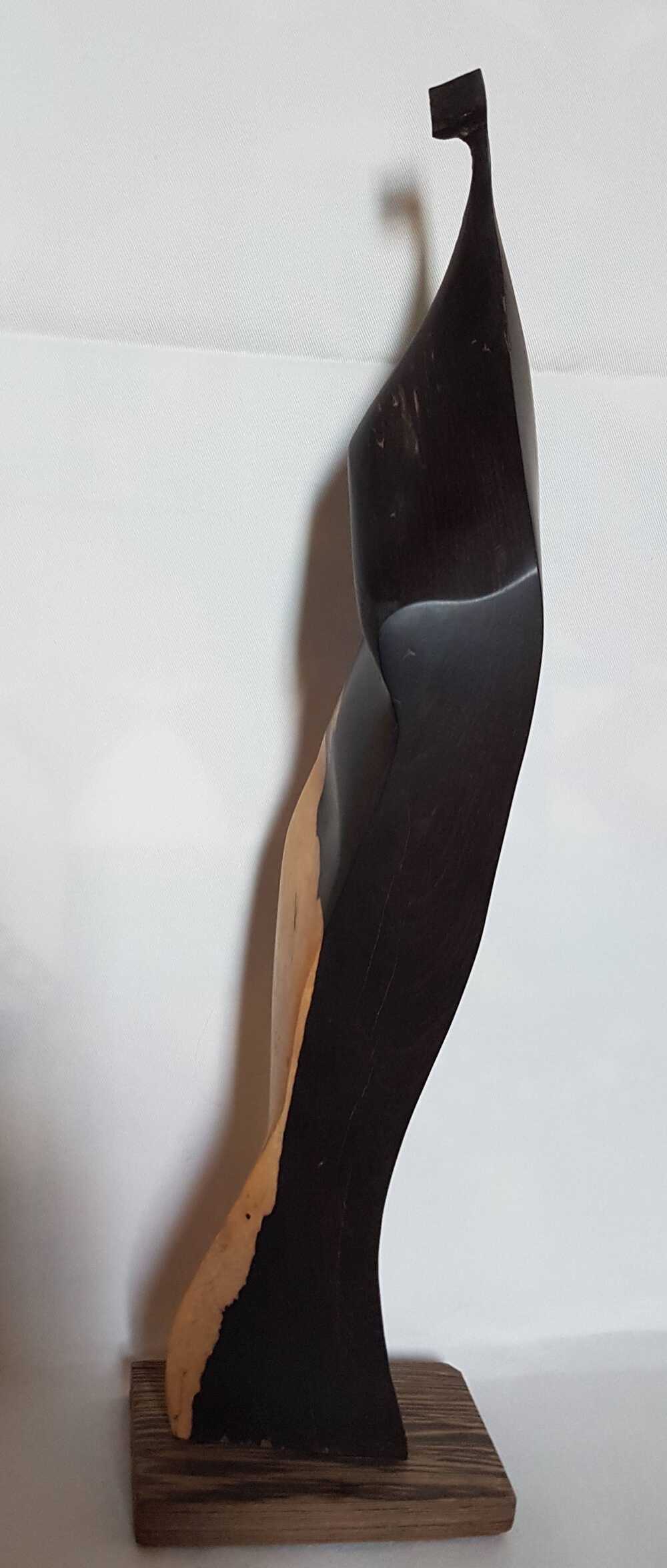 Freie Form mit einer angedeuteten Fahne an der Spitze. Extrem hartes und schweres Grenadill-Tropenholz. Scharfer Kontrast zwischen dem schwarzen Kernholz und dem hellgelben Splint. Holz geschliffen, poliert, gewachst. Fuß: Wenge (kann ausgewechselt werden ).