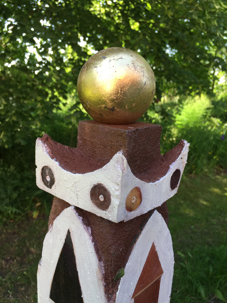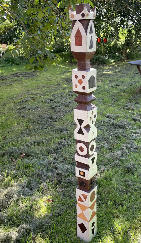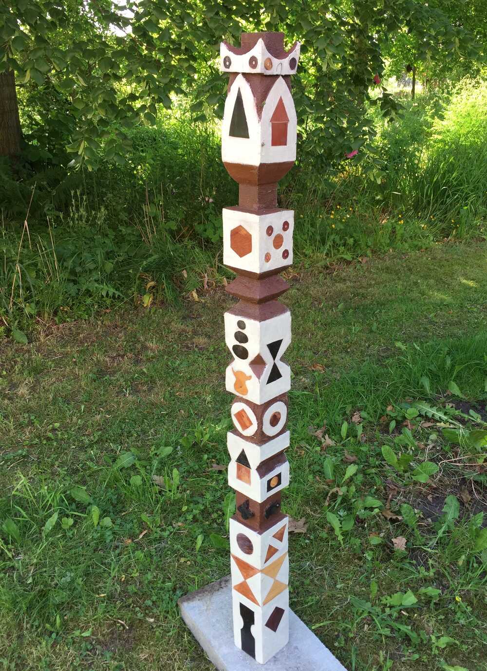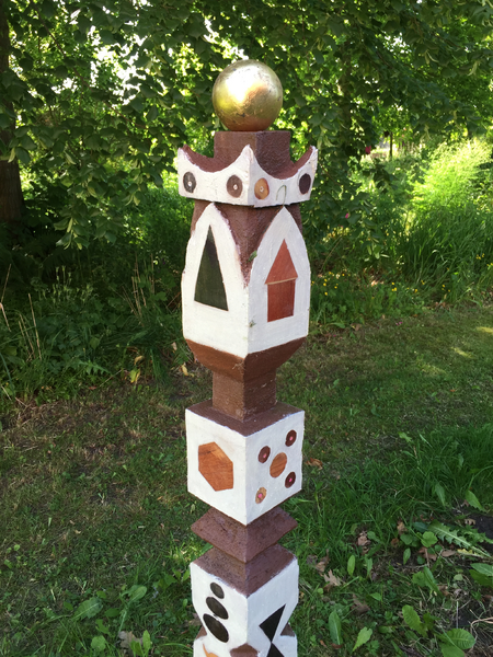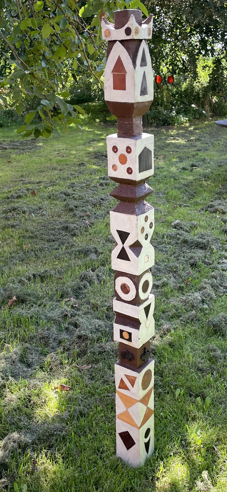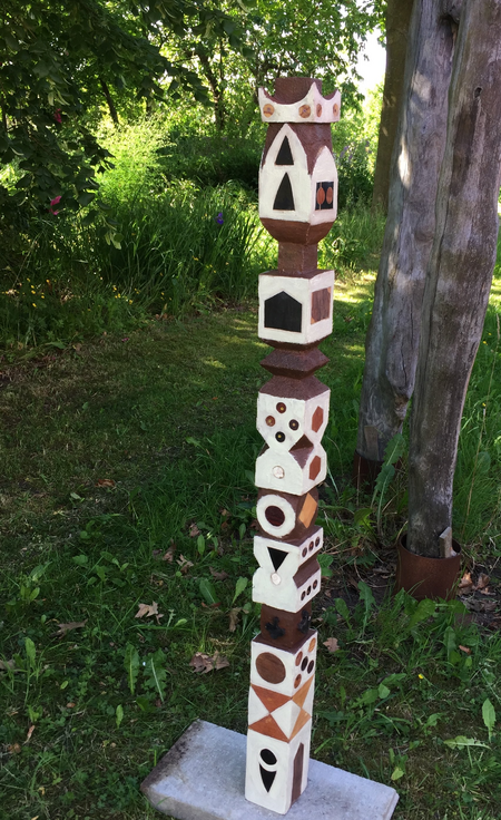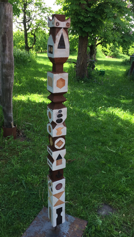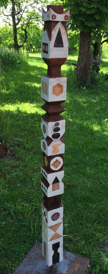Holz-Stele mit unterschiedlichen Hölzern und Materialien