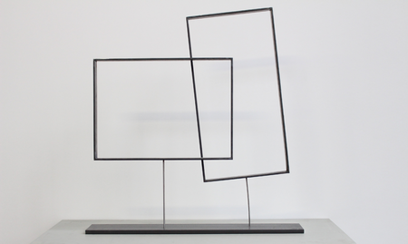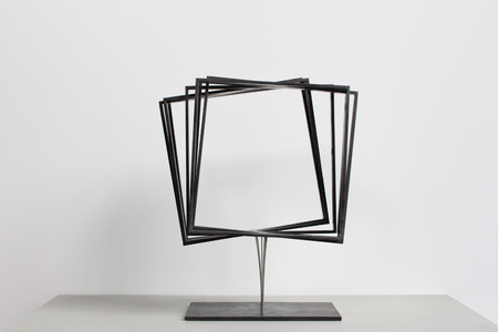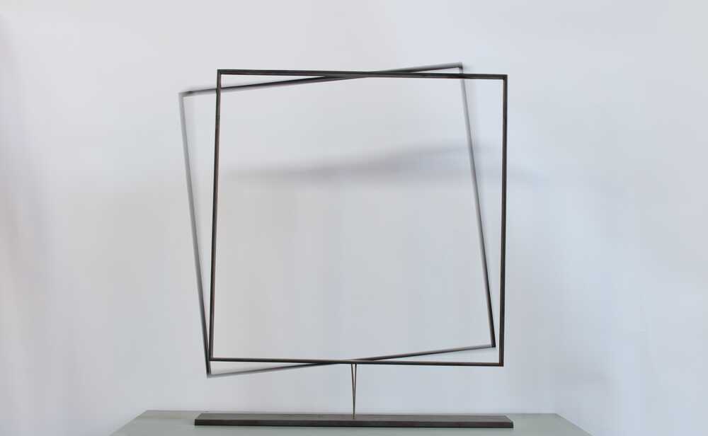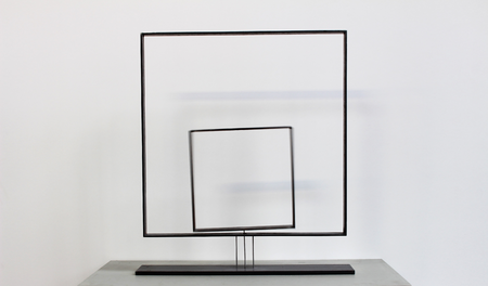 Die Werkserie Touch besteht aus quadratischen Rahmen, hintereinandergestellt, schwebend, auf einem Federstahl gelagert.