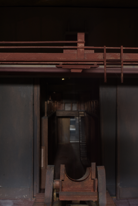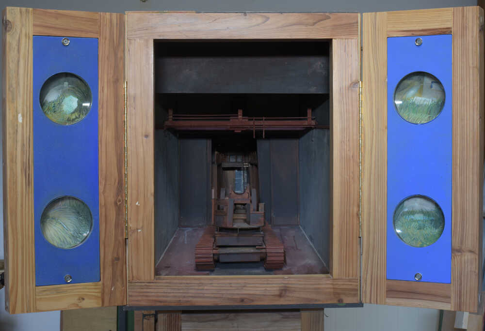 A triptych, with the centre being a cabinet within which is a forced perspective model space. This space is a depiction of a ruined factory, behind which is an abandoned library. Blocking the view into the space is a machine, based in part on a heavy weapons carrier of the early 20th century. The wings of the triptych have four paintings of overgrown glass containers, which have the appearance of miniature worlds where nature holds sway. The overall appearance of the cabinet is based on museum cabinets, or similar display enclosures of the early 20th century. The cabinet is placed on an open wooden frame of 100cm height (not seen in the images). The work alludes to the obsession with weapons that is once again overwhelming the world, to the ruination of the world by capitalist greed (the factory), to the dismissal of knowledge (the ruined library). However, the work is open to interpretation, it sits in a 'context explosion' to use Timothy Morton's apposite phrase.