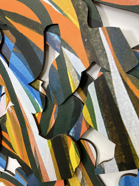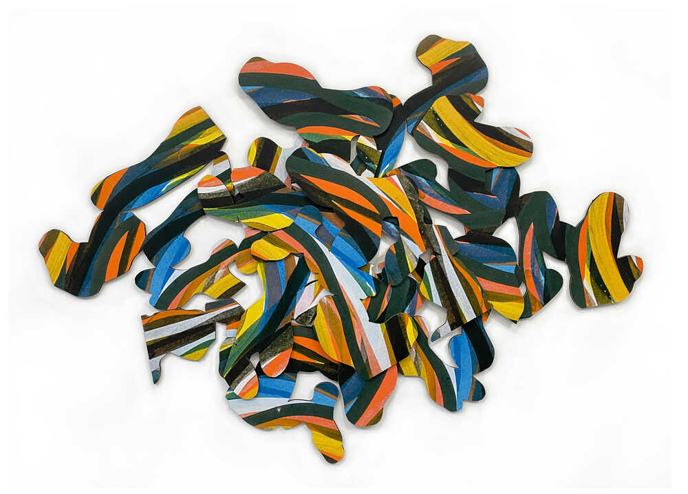 These works are made by appropriating images of iconic artworks from different historical periods that I mine from books, auction catalogs, and magazines. I select specific parts that draw me to their shapes, colors and textures. I cut, arrange and rearrange, playing with their complementary and contrasting attributes and create surprising, lyrical and visually confounding new compositions. I am often amazed at what results from the simple juxtaposition of unrelated forms. It is as if I have released some kind of latent energy in the original work.