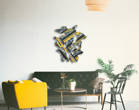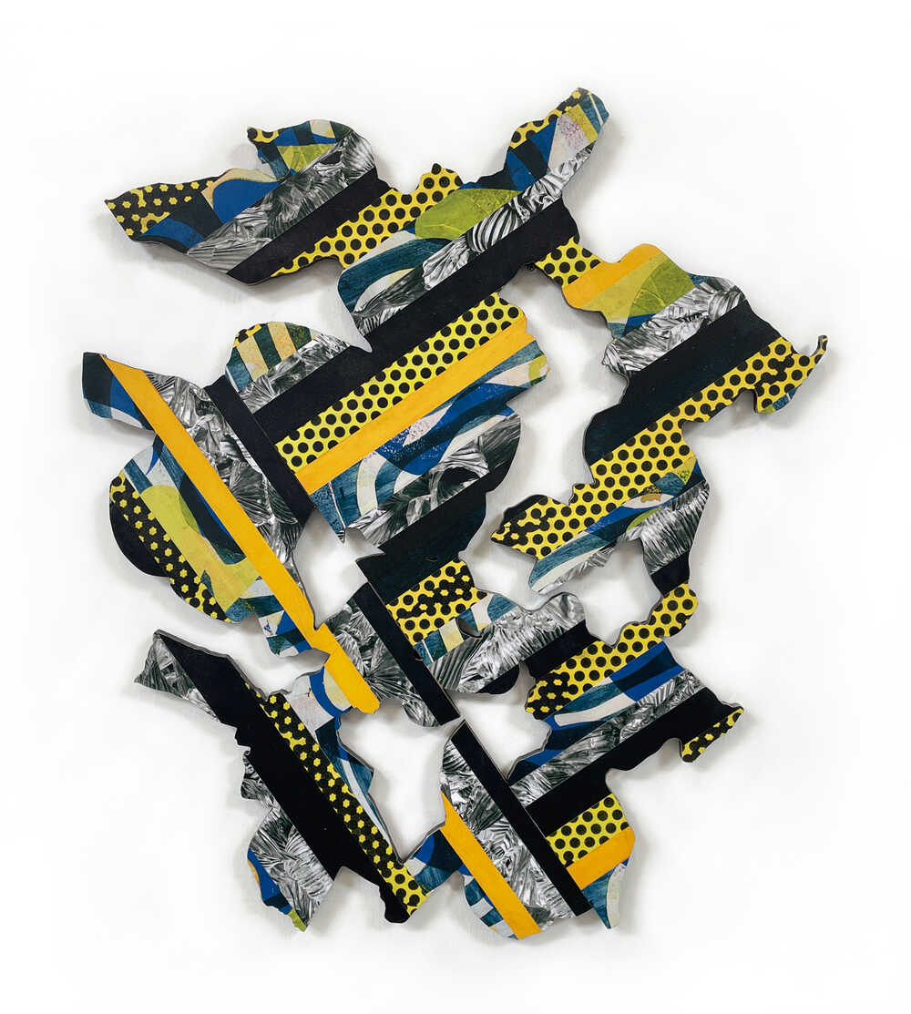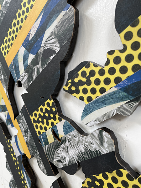 Materials: collage on laser cut plywood, paint.