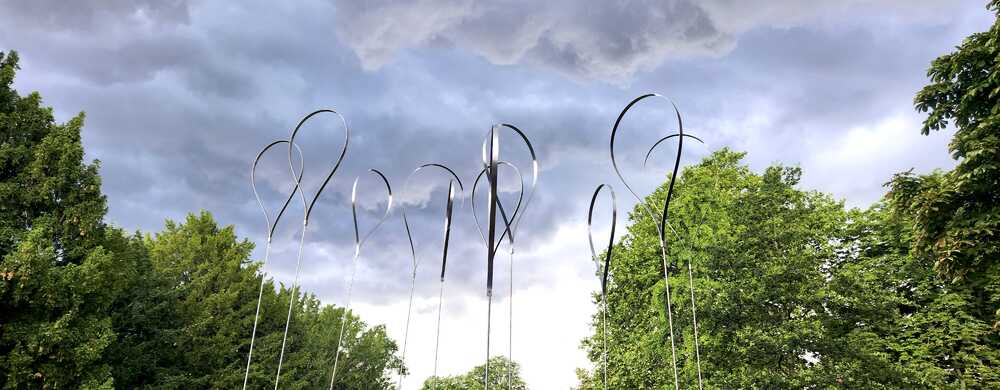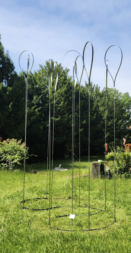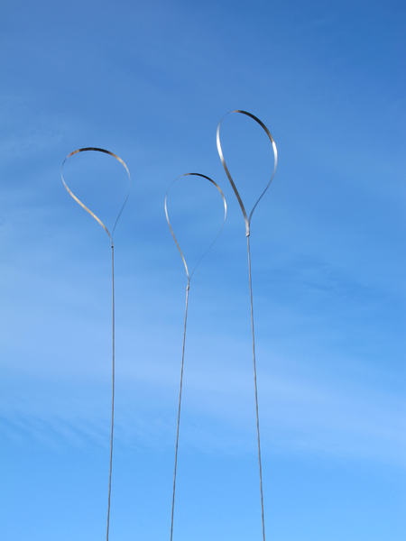 Sie schweben, steigen auf in den Himmel und lassen auch noch weit in der Ferne einen Funken von Hoffnung und Zuversicht auftauchen. Schon ein leichter Windhauch versetzt die filigranen Plastiken des Stahlbildhauers Jürgen Heinz in sanfte Bewegung. In dieser Werkserie schafft der Künstler Bänder aus Edelstahl, die in ihrer Form an Ballons, an Seifenblasen erinnern und die scheinbar nur noch an einem dünnen Faden hängend langsam in die Luft aufsteigen. Die immerwährende, leichte Dynamik der Objekte nimmt in ihren schmalen Flächen die Umgebung auf und reflektiert mit einem zarten Glanz die Farbigkeit der Natur, des Himmels oder des Raums in dem sie sich befinden. Mit der Perspektive des Betrachters wechselt die schmale Silhouette zwischen dem Eindruck einer feinen, dynamisch nach oben strebenden Linie und der dreidimensional fassbaren Figur. Im Spannungsfeld zwischen Zeichnung und Skulptur, zwischen der Schwere des Materials und der Leichtigkeit der Bewegung gelingt es Jürgen Heinz verschiedenste Assoziationen zu erzeugen: Schwerelosigkeit, Unbekümmertheit, ein Ballon im Sinne der Freude und Solidarität. Sie sind kulturelles, politisches, gesellschaftliches Zeichen oder einfach Ballons. Die Plastiken in ihrem Gleichklang von Bewegung, Form und Farbe initiieren somit in reduzierter, minimalistischer Sprache einen ganz eigenen, individuellen Dialog mit ihrem Gegenüber.