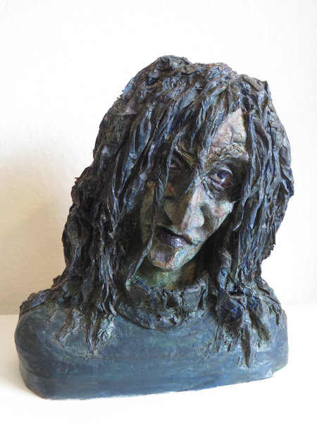 Januskopf wirft die Frage auf, wie weit sich Menschen in der Welt der »sozialen Medien« ein anderes Wesen geben können. Sie leben in dieser virtuellen Welt ein anderes Sein als in ihrer Wirklichkeit. Auf der einen Seite eine schöne, junge, lächelnde Frau, leicht geschminkt. Doch wie echt ist sie wirklich, wenn wir sie auf Online-Plattformen im Netz »liken«? Steckt hinter dem fröhlichen Wesen vielleicht ein Mensch, der sich im Dunkeln gefangen fühlt und nach Aufmerksamkeit sehnt, die er sich durch seine schöne virtuelle Seite erhofft? Und ist auf der anderen Seite der, der sich mit Technik der Virtuellen Realität als Zombie inszeniert, nicht vielleicht eine freundliche Frau, die sich einfach danach sehnt, die engen Grenzen des Menschlichen auf Zeit einmal zu überschreiten? Die Skulptur zeigt beide Gesichter, was sich von der Seite im Profil aber kaum erkennen lässt. Was die Vorder- oder die Rückseite ist, liegt allein im Auge des Betrachters.
