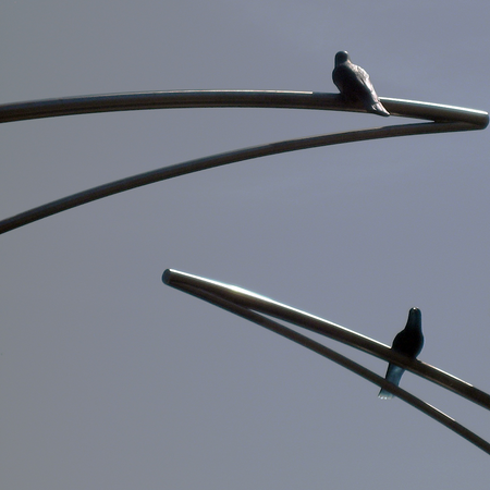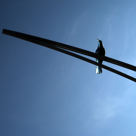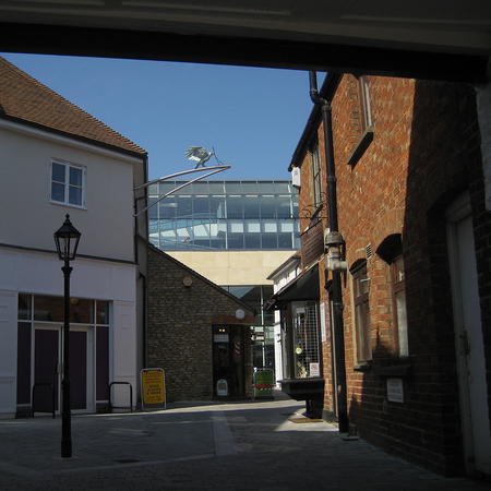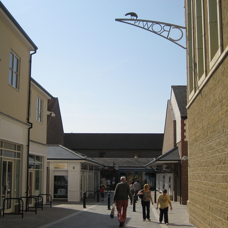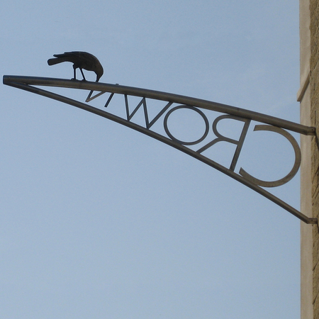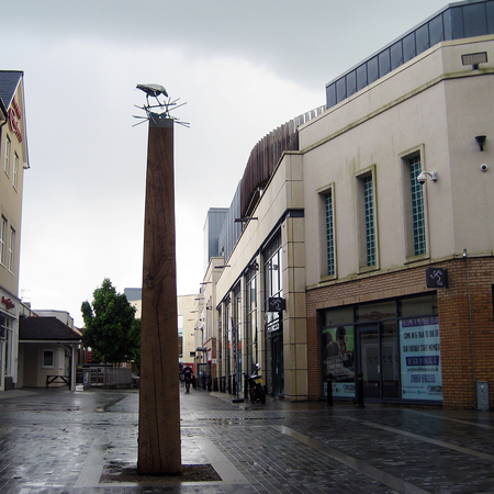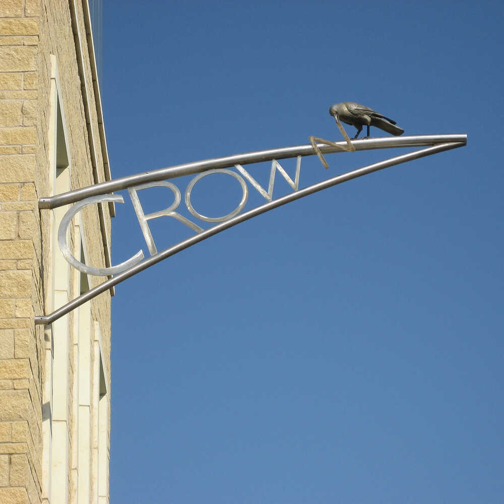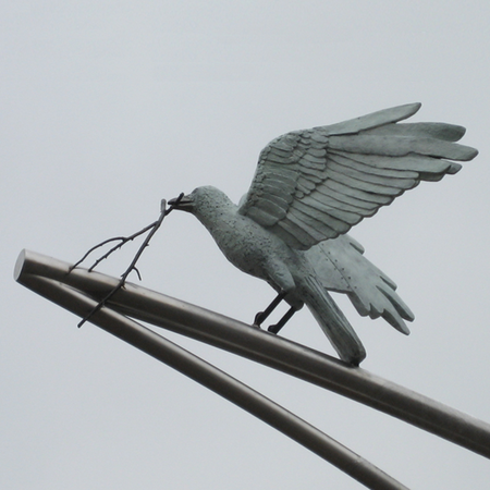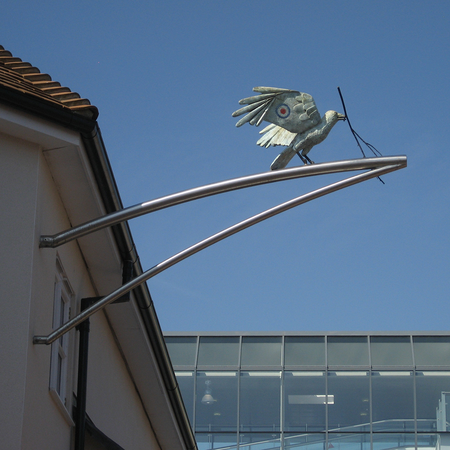Diane's four crows, two bronze, two cast glass, each sit on their own stainless steel arc, all are placed in sites around the new town centre development in Bicester. Sited in Crown Walk, the bronze crown crow steals the letter N in a play on words. The two contemporary cast glass crows have a surface texture that combines lace and pattern. Lace making was a cottage industry in Bicester and now Bicester is known for designer fashion.The flying bronze crow combines two themes - the RAF and Homemakers. The RAF used to have a base near Bicester, and is represented by a wing featuring plane parts in place of feathers, with the RAF logo. The other wing is feathered, the crow is shown taking off with a stick in its beak to add to its nest - symbolizing all the new eco-homes being built in Bicester.