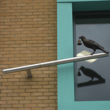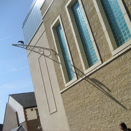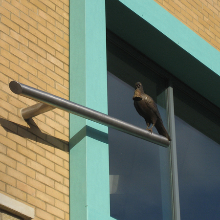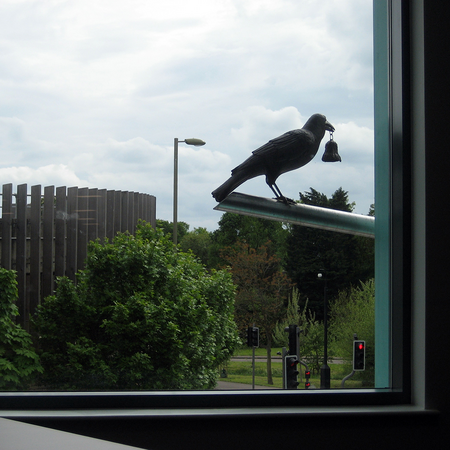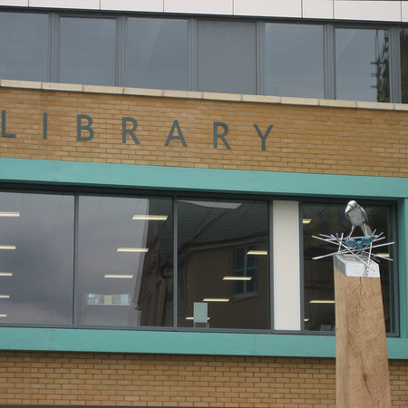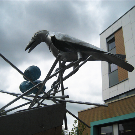 The Trail of crows was extended in 2016 by Phil's Crows Nest sculpture, a welded and galvanised metal crow and nest with glass eggs, lit at night by solar lighting fixed to a carved oak plinth, and Diane's Bell Crow bronze on a stainless steel perch, both are sited outside the new Library.