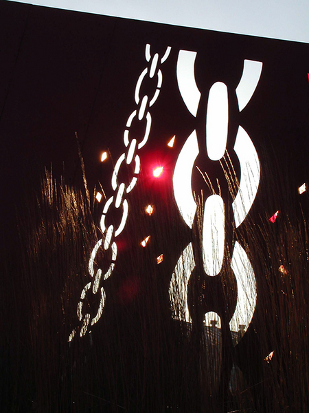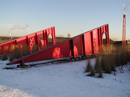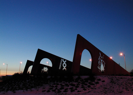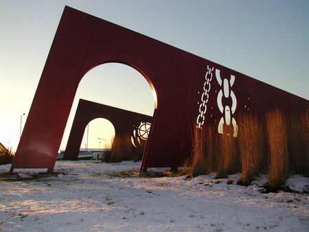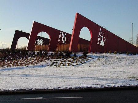 The theme for this 85m wide roundabout was Fires of Industry. There are three steel wedge/arch structures 6m high x 25m long. Each wedge contains a profile cut design representing a local industry - glass, chain making and mining. The different shades of red on each structure denote the range of red heat in tempering steel. Coloured glass âsparksâ are set within the cut out designs.