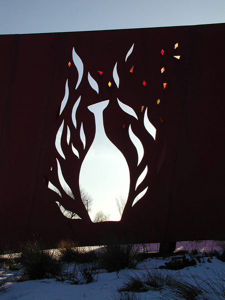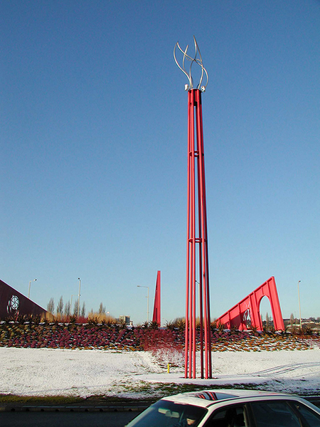 A 16m tall steel Flame Tower on the edge of the roundabout is topped by a 4m tall âFlameâ in stainless steel tube. The planting was designed to work with the sculptures and emphasise the alignments. Phil designed the Arch/wedges and landscaping, with Diane drawig the cut out designs and making the 3m high bronze final sculptural element Heroic Worker  made in direct plaster on Phil's armature, and moulded in our studio, and cast into bronze at Castle Fine Arts Foundry.
