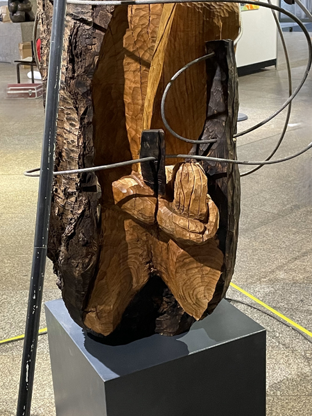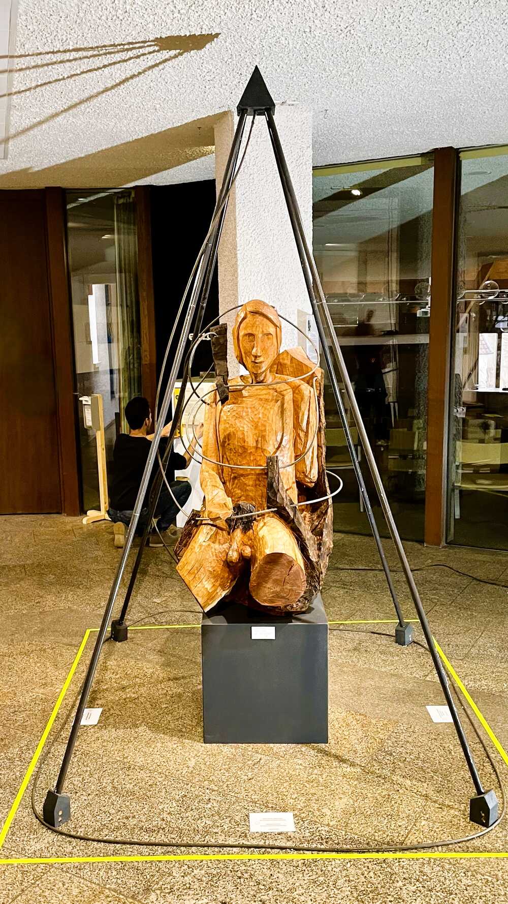 Die Pyramide aus schwarzen Stahlrohren stellt den hierarchische, absolutistischen Machtbereich dar. Aus dem Körper des Narzissten wachsen schwarze Stäbe zur Aufnahme der Stahlseilumwicklung. Die angsteinflößenden Verstrickungen in seinem Innenleben, aber auch zu seinen herabgewürdigten Mitmenschen ziehen sich zu.