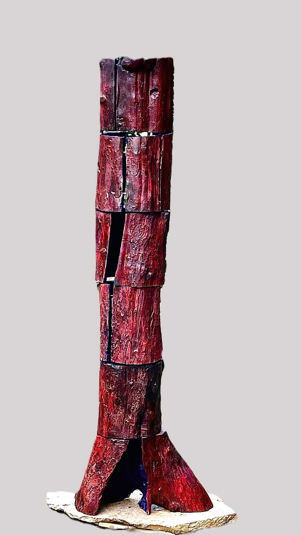 Der Baumstamm ist kraftvoll rot lasiert. Der ultramarin ausgemalte Innenraum gibt der Säule eine spirituelle Tiefe.