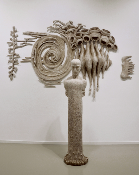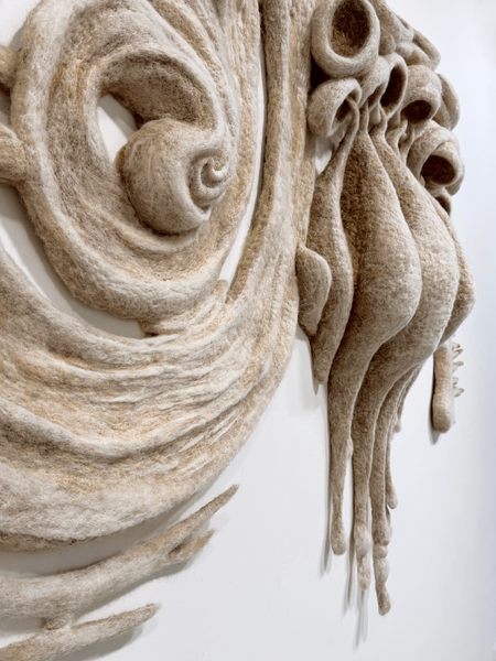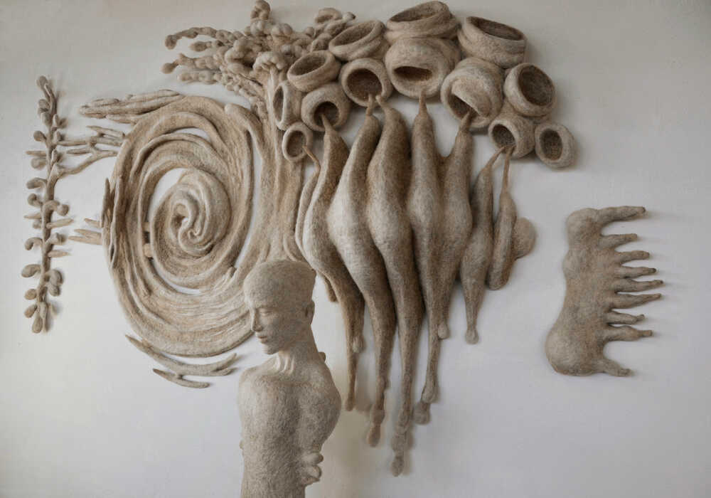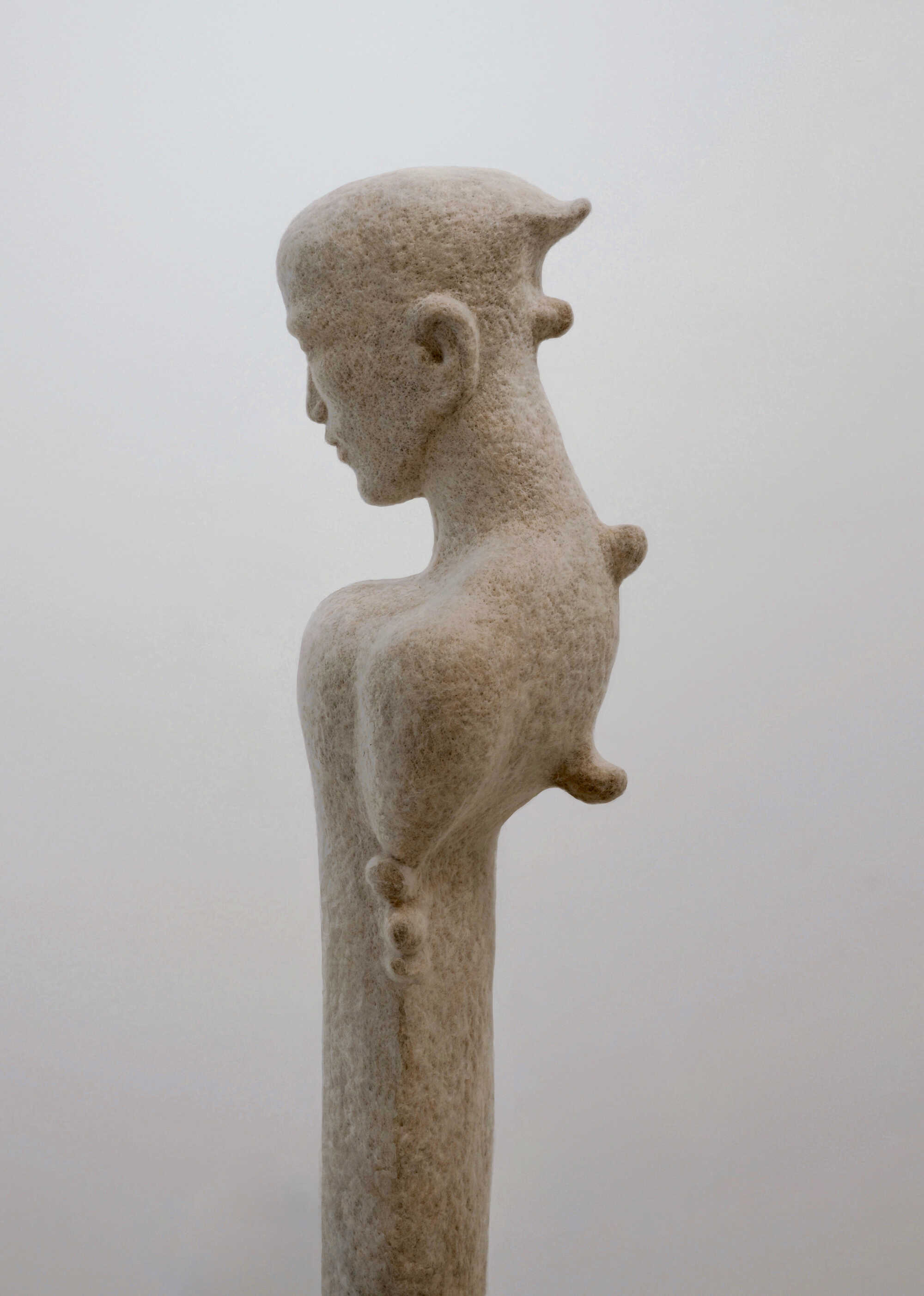 As the title suggests, it is about the rich, vibrant inner life of the standing, introverted figure. The “synapses” on the back of her head and back point to the connection with the relief-like forms of movement, memory elements or sound forms on the wall behind her.