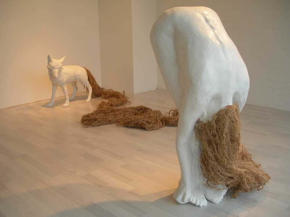 The naked, vulnerable woman in Inescapable wrestles with the fox, representing her talents. She is inextracably connected to the fox but can reach it only with great effort: a fox rarely shows itself.