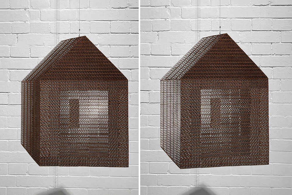 Ein zeichenhaft auf die Fläche reduziertes Haus, zeigt aus unterschiedlichen Blickwinkeln erst Stofflichkeit, dann Transparenz – es erscheint ebenso real wie virtuell.