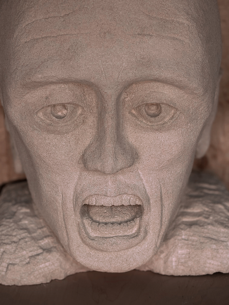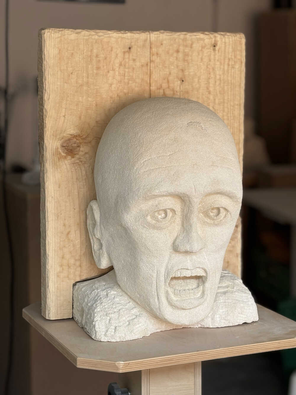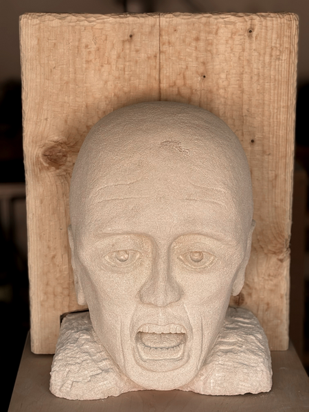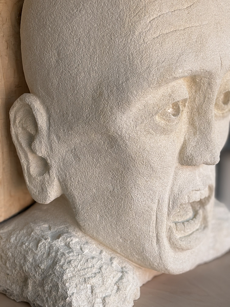 Like a cry, exalted by the soft, matt stone, the expression is contained, held back, as if stifled, by the absorbing power of the wood.