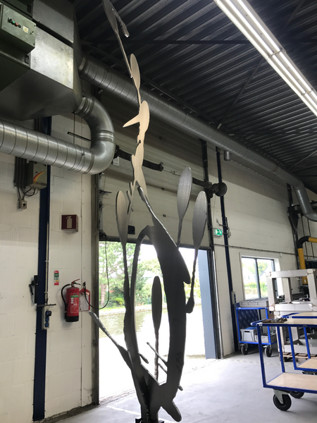 Growth is made for a pond and rises out of the water. The cyclic form at the bottom near to the water surface gives energy to the forms to rise up towards the light. The light is playfully reflected by the thick stainless steel which gives it a sparkling expression when the light relects on the 12 mm thick steel.