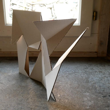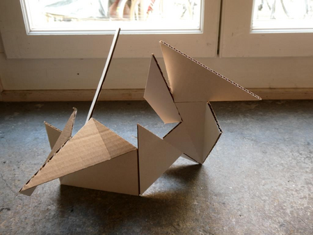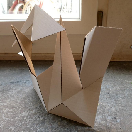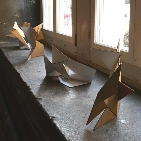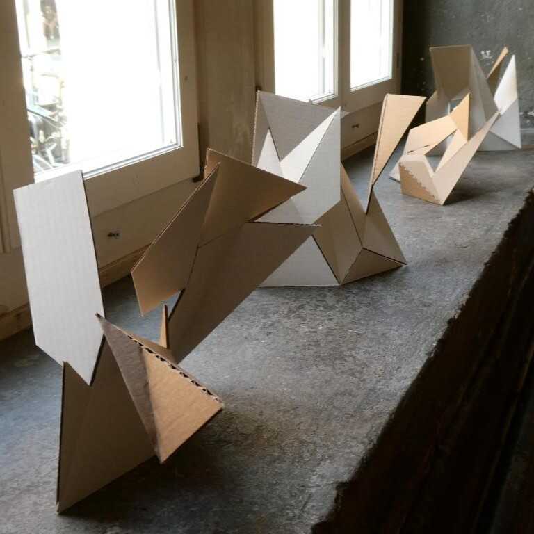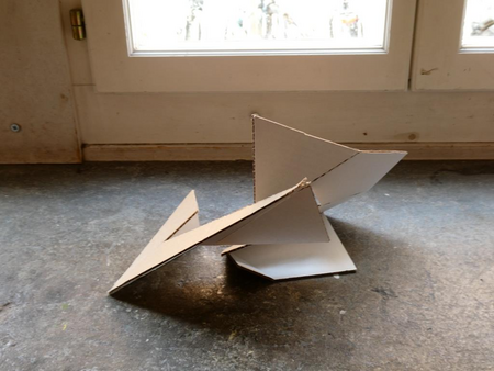 Ein Quadrat, aufgeteilt in 14 Flächen nach einem mathematischen Entwurf von Archimedes, wird angeschnitten und geknickt. Es entstehen unterschiedlichste 3D-Figuren mit vielfältigen Schattierungen, obwohl die Grundform immer noch eine quadratische Fläche ist.