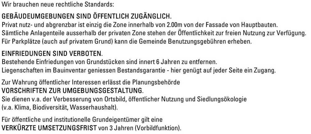 Eigentumsgarantie und individuelle Freiheit haben ihre Grenzen da, wo sie Gesellschaft oder Umwelt beeinträchtigen. Wir brauchen einen neuen Rechtsstandard zum Siedlungsraum ohne dass er zu einer unbezahlbaren materiellen Enteignung führt. So dürfte mein Vorschlag z.B. das Ende der grossflächigen oberirdischen Parkplätze und der Anfang einer grosszügigen, zweckdienlichen Neugestaltung des Siedlungsraums einläuten.