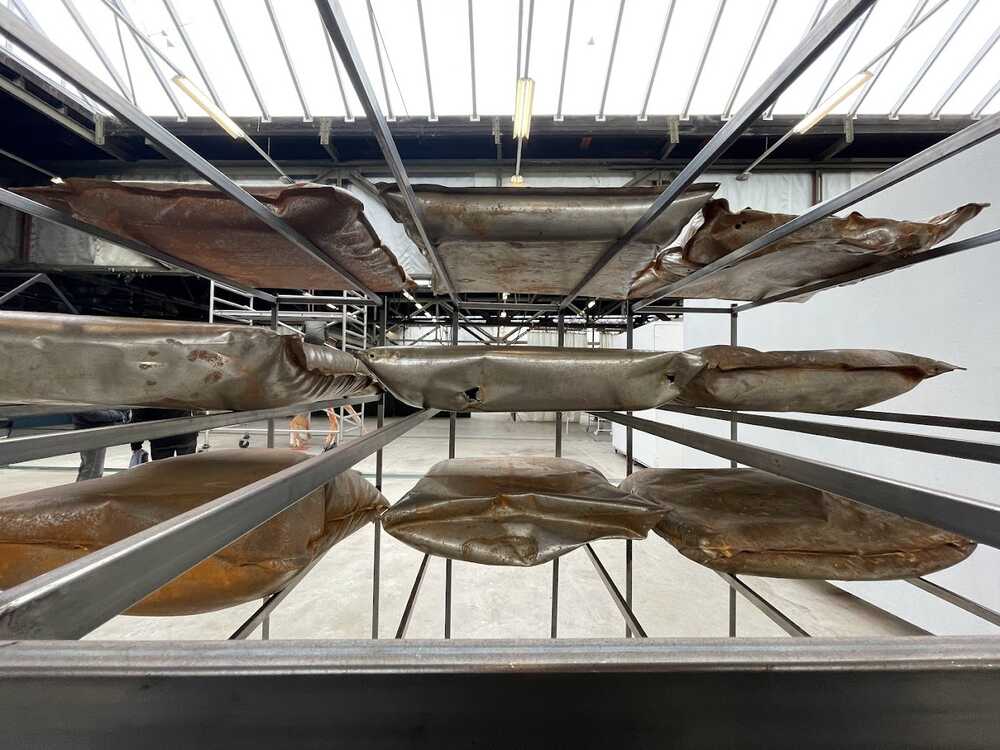 There are no sweet dreams on these beds, but rather nightmares about the flight and the journey here, where sometimes there are not even bunk beds available... The 'pillows on the beds' are cushions used when splitting marble from the bedding of the mountain. When flat, metal 'pillowcases' are hung on an iron wire between the saw cuts and then inflated under high pressure to form a convex cushion. Marble has a crystal structure, so it breaks easily.