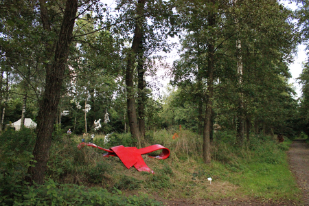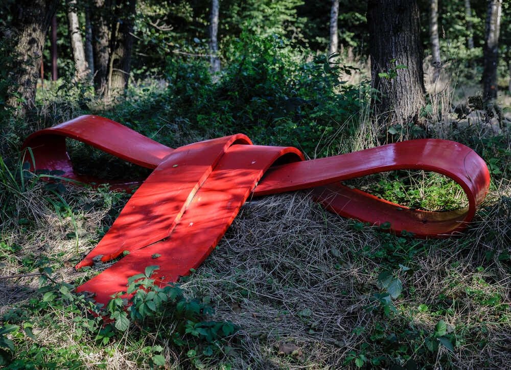 Eine rote Schleife aus altem Förderband von UNTER TAGE. Eine Hommage an die Heimat, das Ruhrgebiet.