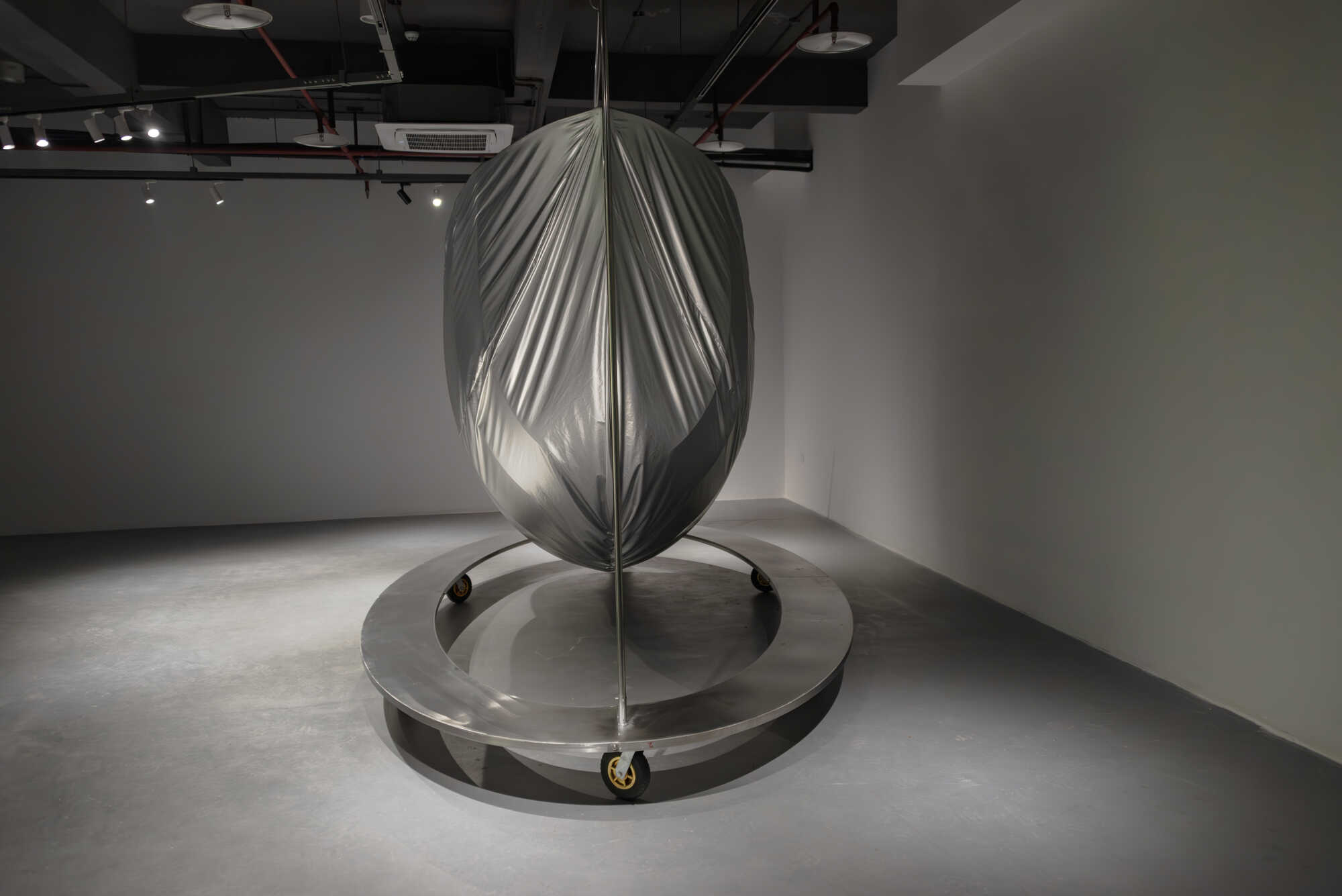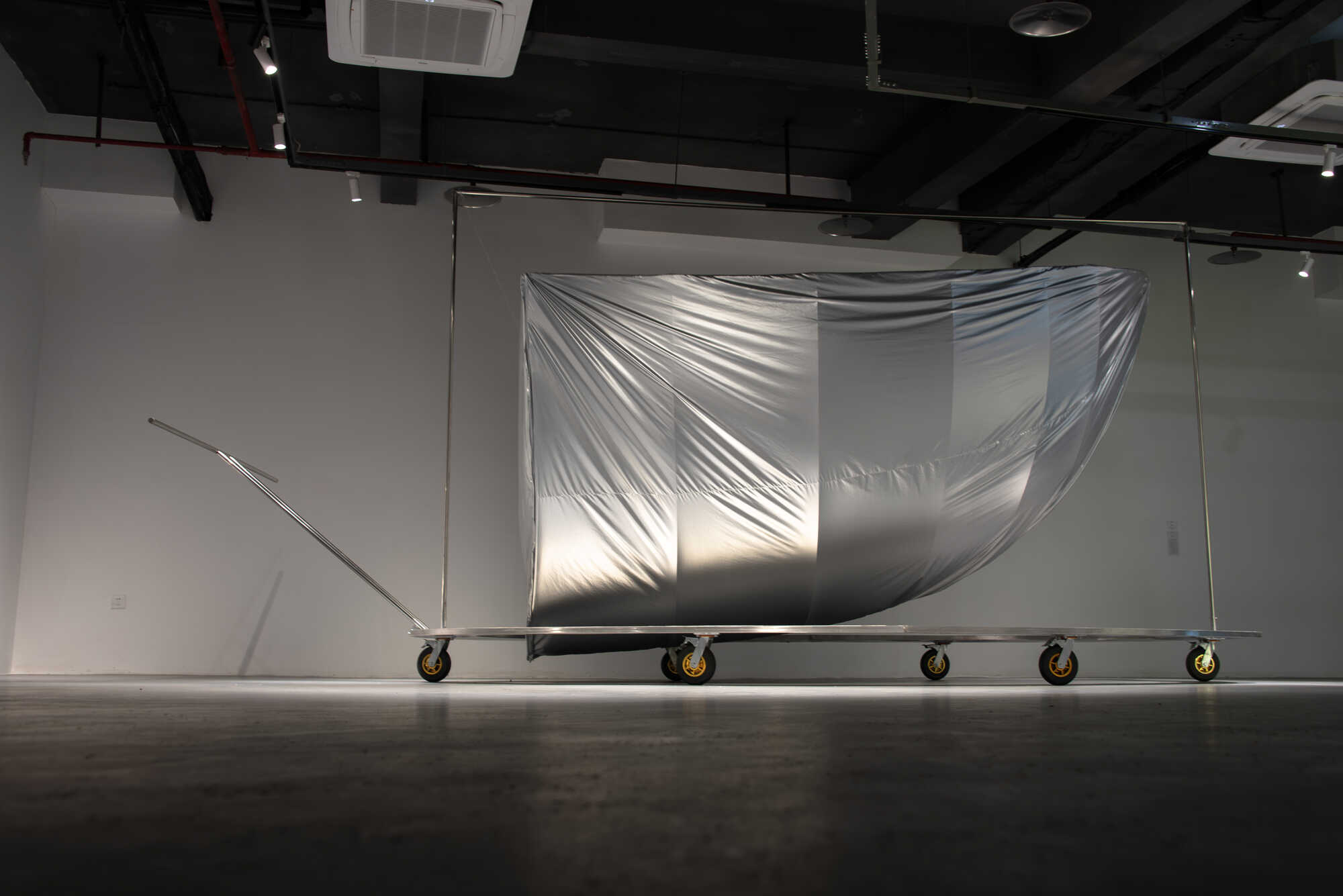 Just as the Ark marked a return to an originary point, so does Meta-Ark mark new beginnings, aleatory points from where the unwanted stranger steps forth. Meta Ark's divergent reflections capture and disrupt, sparking unexpected new constellations. Fabricated in the manner of a tent, with fabric stretched over fibreglass rods, Meta-Ark is a vessel that longs to return to the landscape. Mounted upon a portable jetty, it yearns to roam the streets, traversing paths both imagined and real. Meta-Ark floats on its portable jetty like the unwelcome stranger that comes today and stays tomorrow. Meta-Ark is an unruly stranger whose imagination, like the outcast artist, roves without order. Meta-Ark is an expedition to new centres that linger like mirages on the breeze. Meta Arc's journeys actualise other dimensions, virtual worlds, and chance encounters in an assemblage of wayward walks that redraw the city. Meta Ark appeared at the SSG solo exhibition, Is the Fake Real? Envisaged in 2023 as a central element in a performative project that would walk through the streets connecting the city's diverse cultural background, the project, two years in the making, still awaits an appearance on the city streets.