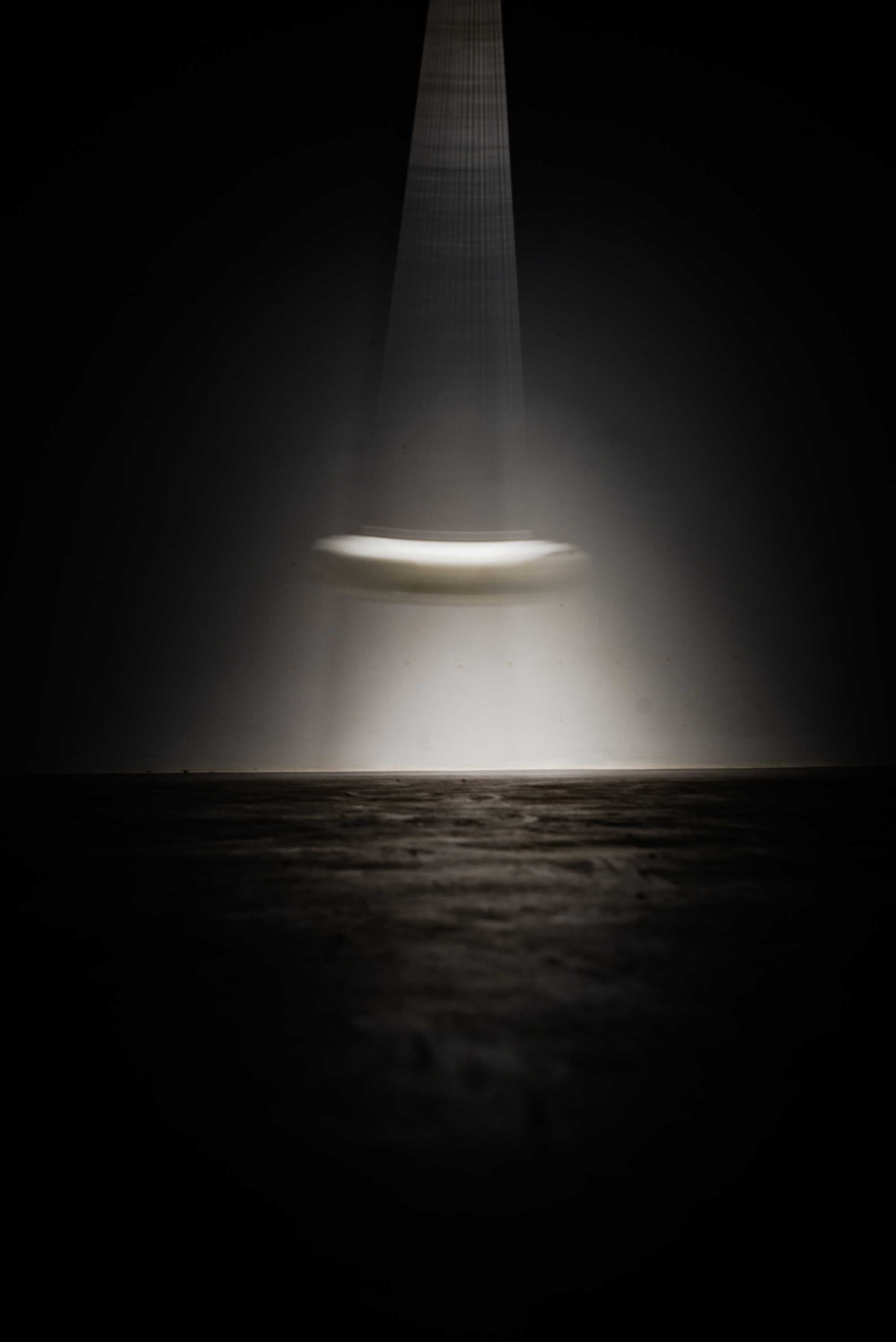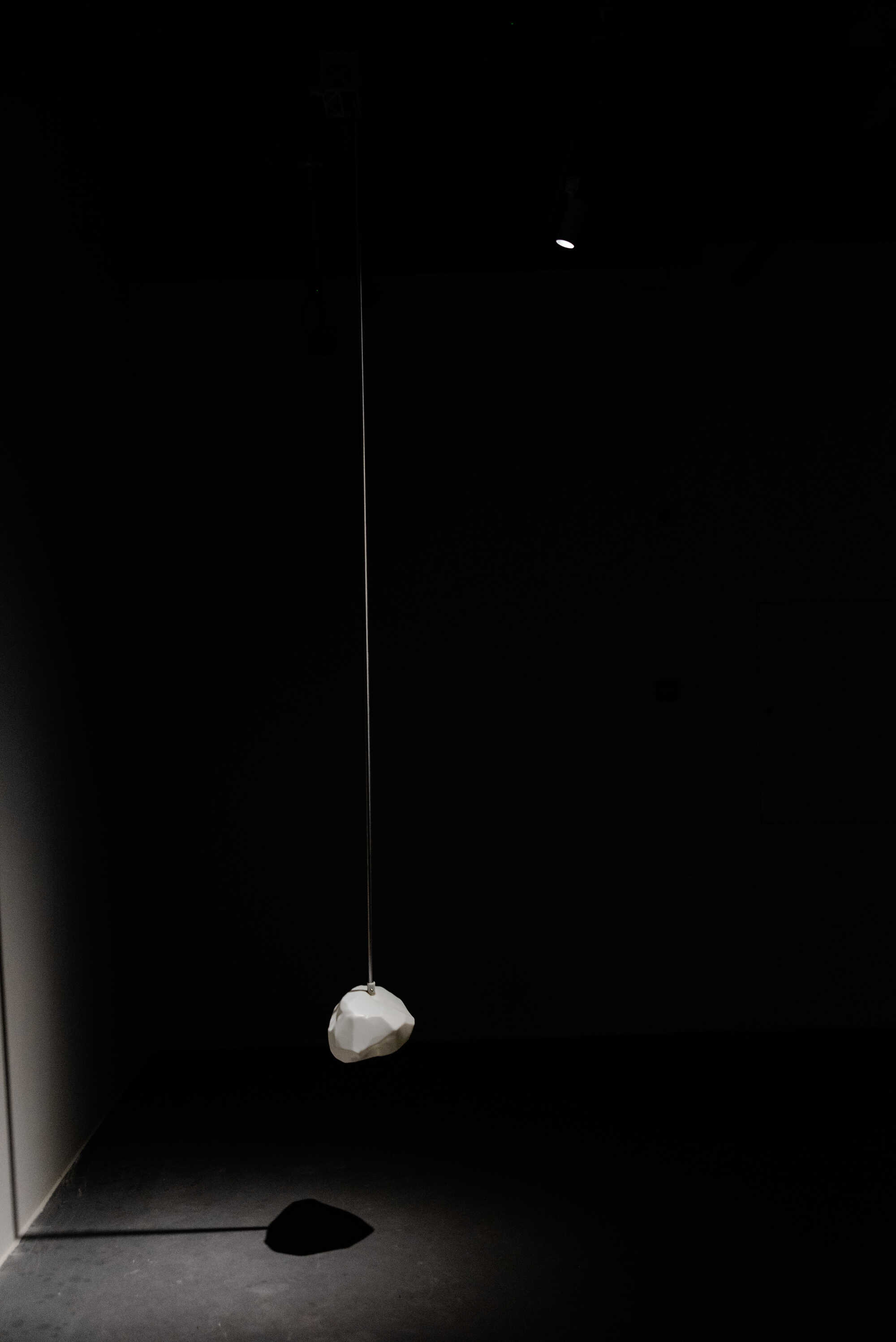 Geological Time enacts a playful yet forced motion that propels us into the lived present. The soft clicks of its stepper motor punctuate the silence, marking moments of rupture and return. A rock-like white resin fragment, suspended from the ceiling, gently oscillates, revealing the passage of its own internal time. What initially appears to be a familiar fragment of landscape gradually discloses difference, exposing overlapping durations and a time that drifts out of joint. As the past pushes into the present, its repetition is ingrained in the shape of the future.