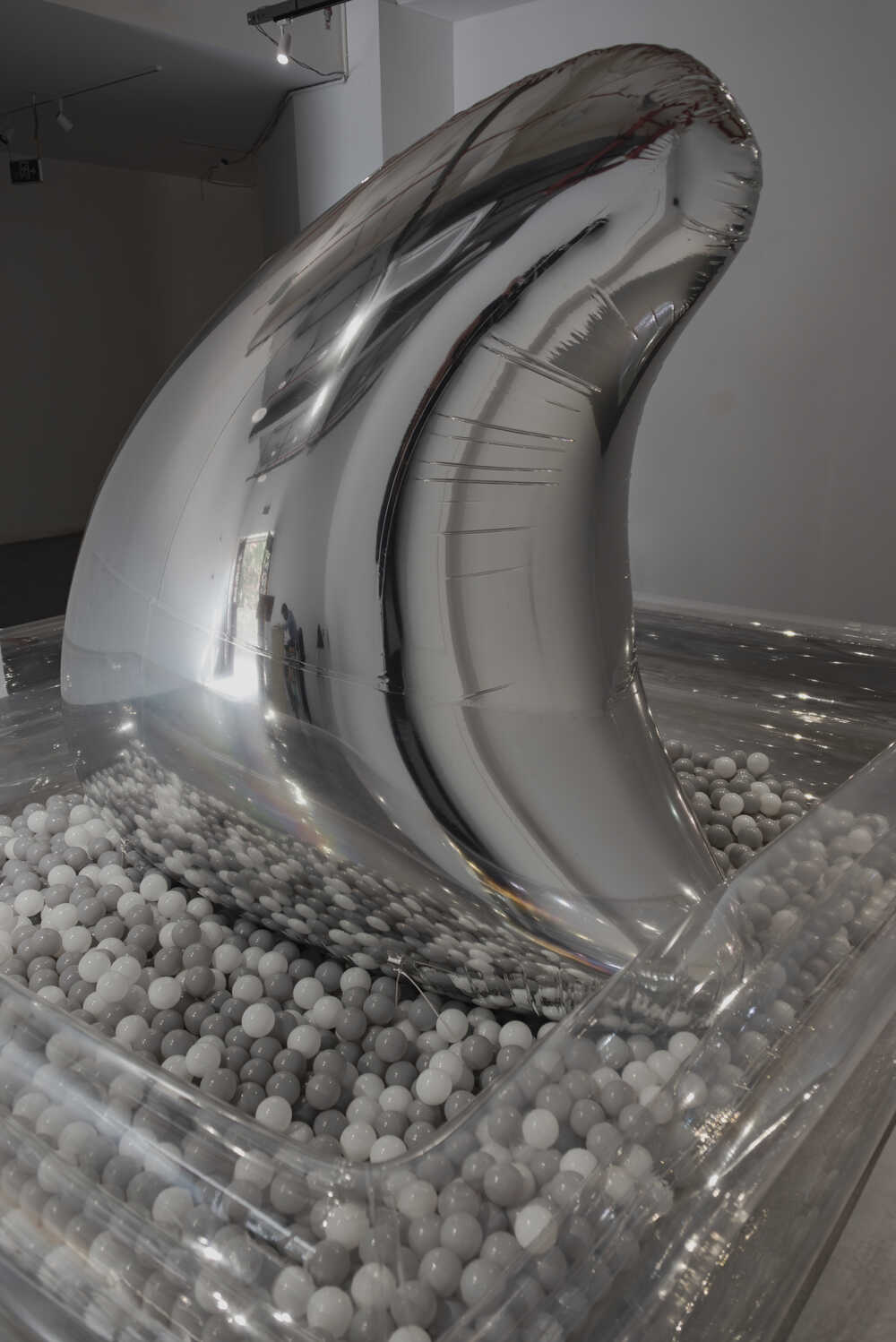 A shark-like mirrored fin drifts in a pool of monochrome balls, capturing the world in its oblique reflections that transport the viewer to the liminal space between land and sea, where the ceaseless sound of waves breaking on the shore lingers in the air.