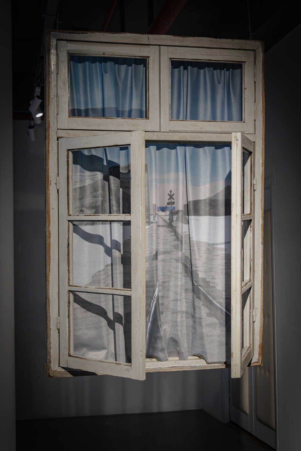 Presented at SSG's solo exhibition, Is the Fake Real?, Stay on the Path draws on a photograph taken by SSG in the salt fields of Uyuni, Bolivia. The image of a railway track across the desert reappears inside a three-dimensional digital model, mounted on a billboard that stands in the rendered landscape. Around it, the track, a carriage, and the desert floor are all 3d models generated by SSG—fake reconstructions of the real scene. In generating this terrain, the software produced unexpected golden glitches, seams that fracture the surface like veins of ore. These accidental forms recall the region's mining history, where hidden seams once reshaped both community and land. The image is printed on a perforated net curtain and hung within an old wooden window frame, partially open, its glass still intact. This weathered frame acts like a memory-object, its quiet decay echoing the corrosive forces of the salt desert. The curtain's translucency lets the image waver, sometimes present, sometimes fading, like a recollection dissolving over time. Here, the real photograph, the fake digital rendering, and the fragile window frame converge. Stay on the Path in a window that opens on the question of where reality lies: in the photographic trace, the digital model, or the decaying frame that holds them. It suggests that paths—like images—may guide us toward the real, into the virtual, or into the fragile thresholds where memory endures.