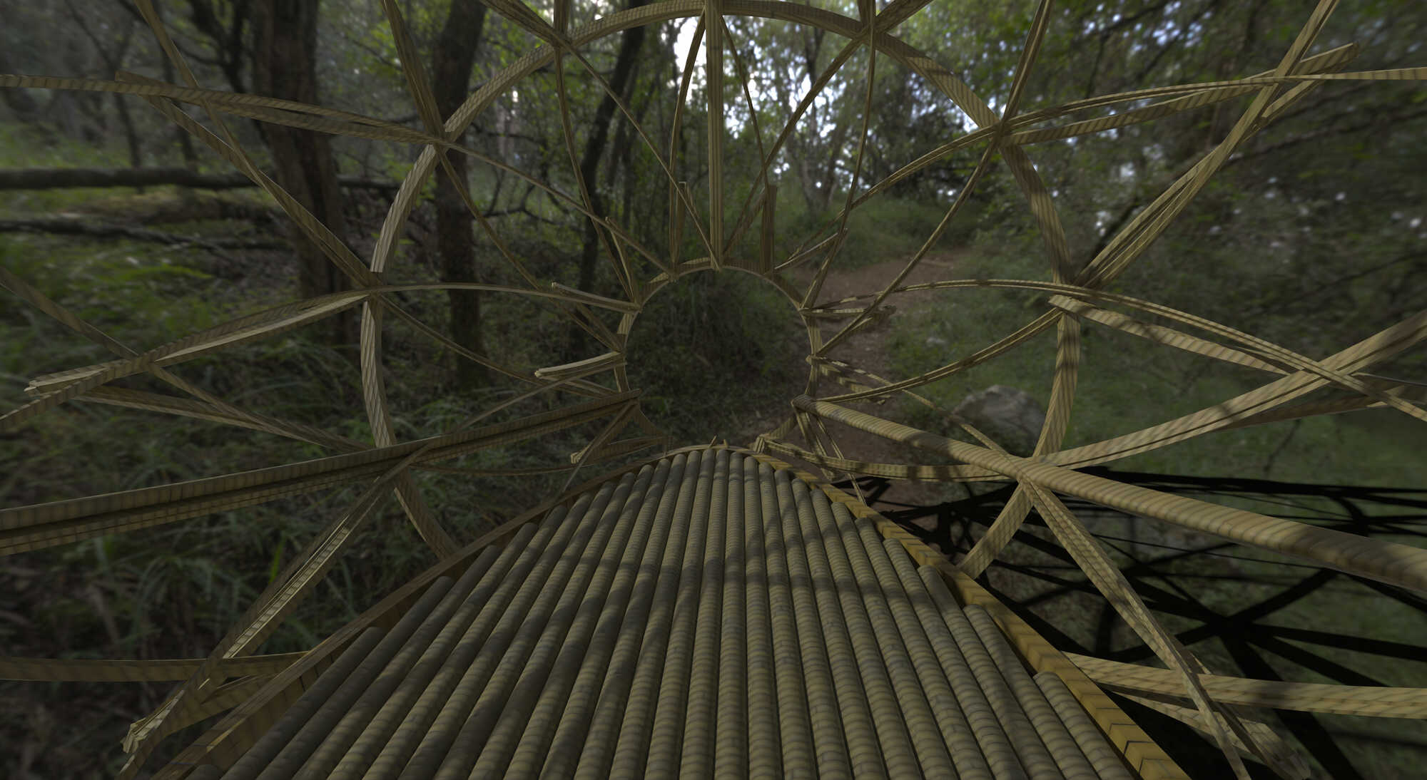 Pine Cone rests like on a forest floor, sheltering its seeds. Pine Cone invites the viewer to contemplate the dynamics of the forest, a dynamic that expresses the forest’s complexity and fragility. Through the dynamics of the seed, the work locates within the forest a spirit to respond to the challenges and perils of climate change. By entering the Pine Cone’s shelter and resting on its platform, the viewer embodies the seed, which sits in active contemplation within the interior of the protective cone. Pine Cone initiates a dialogue through art in which the human and nature concur and by which we learn from the seed, which, after a period of quiet contemplation, passes beyond the cone to become at one with the forest. Pine Cone’s bamboo construction forms an eco-shelter that offers one way we might connect with nature and become friends with the forest. If bamboo were used widely in the construction industry, it would significantly help reduce the amount of carbon in the atmosphere. Create a proposed shelter in the forest.