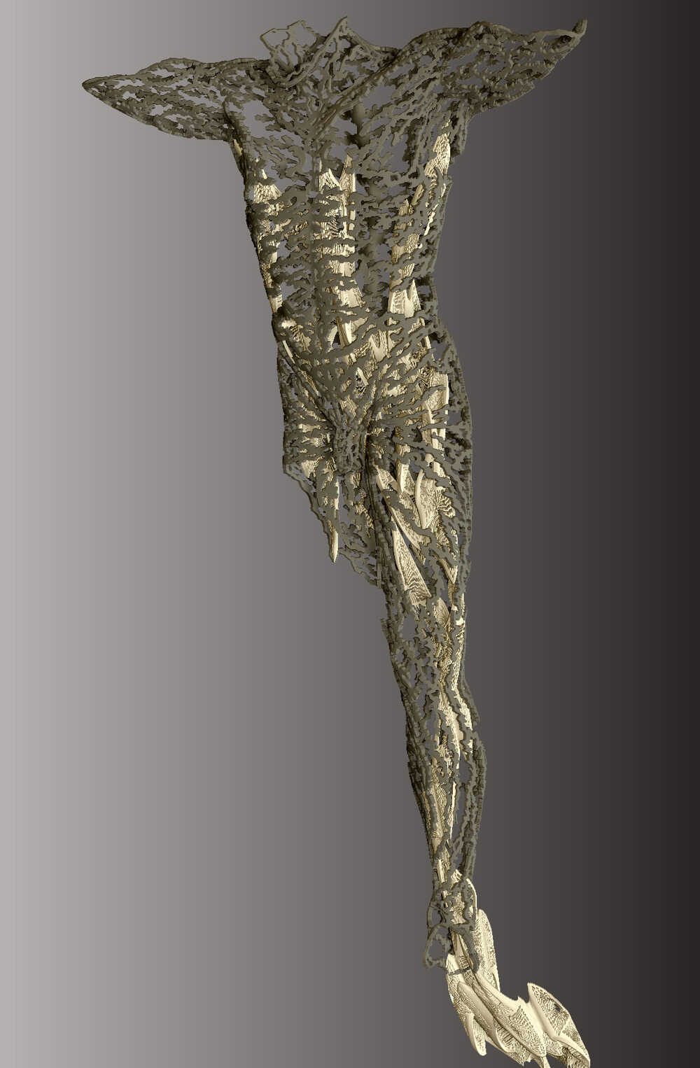 The original file was created in ZBrush a 3D CAD software program. This digital file was build on top of an original scanned sculpture and an interior structure was added. The complete digital file was then printed on a SLS 3D powder bed printer in a wax polymer and cast in bronze using the lost wax process at ArtCast Foundry in Canada.