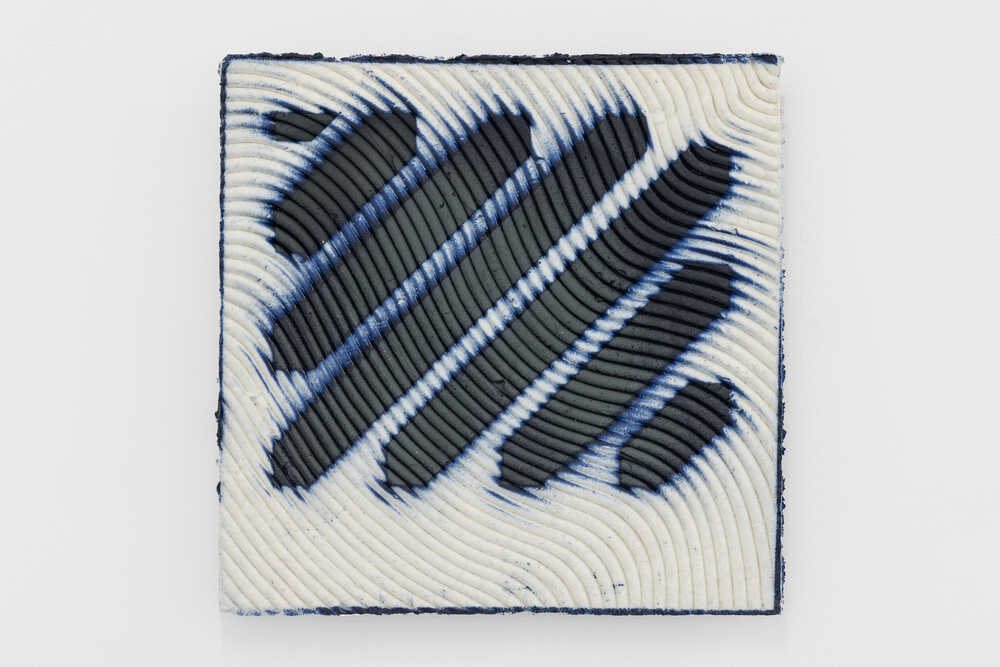 Copying, mimesis, repetition is the essence of our culture. Although the West seeks the utopia of the “unique and original” piece, China clings to the mutable and the process of drift, doing so through shanzai: adapting the copied until it becomes something else. Barreiro deconstructs this ontological framework by turning it on its head: the copy, the serial piece, which can be repeated infinitely, becomes a work of art. He takes traffic signs — arrows, triangles, mandatory rings, warning diagonals — and grafts them onto plaques and volumes worked in white paste. Cobalt oxide — the historic colour of Portugal, of tiles and Vista Alegre — appears in gradients that emerge from the relief: spikes, grooves and meshes that capture the pigment.
