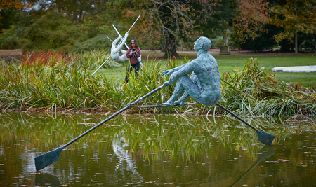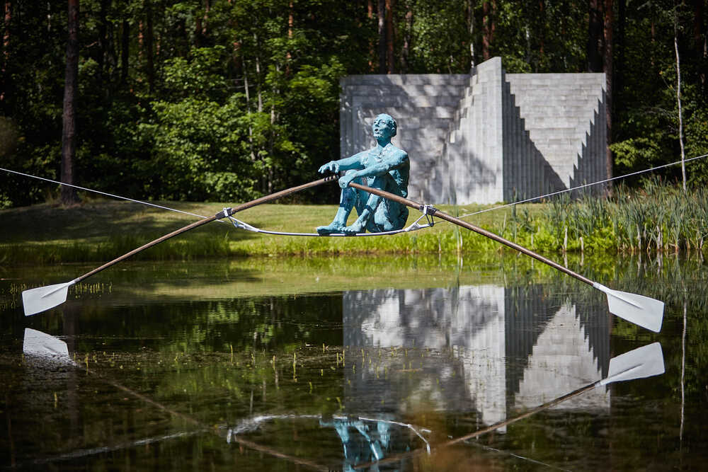 Balancing sculpture, proprietary synthetic composite, steel, ca. 240x120x110 cm + 2 x paddles 375x10x25 cm