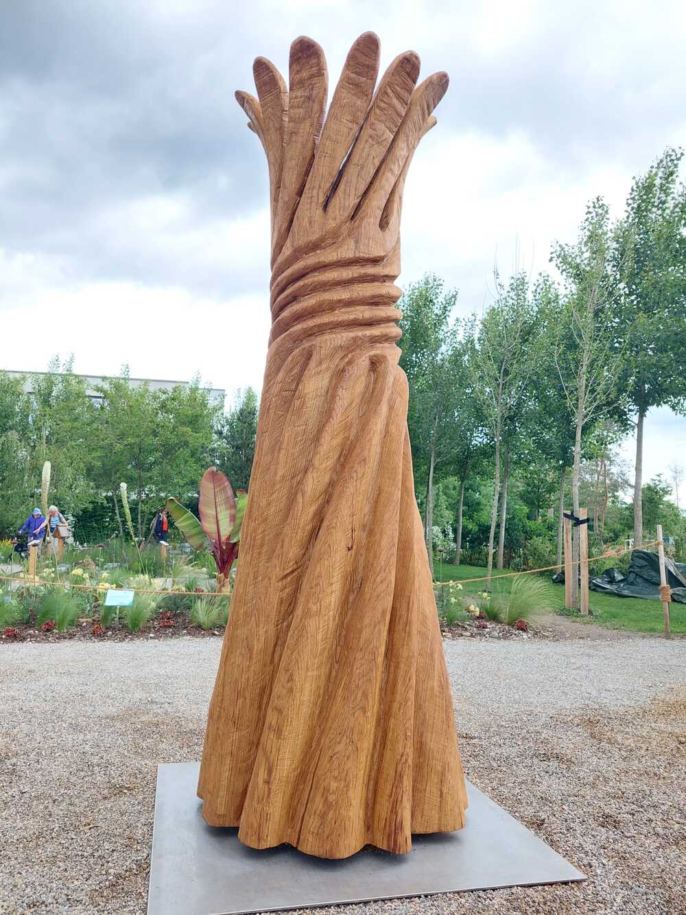 2024 in Kirchheim/Heimstetten ab: Zusammen-Wachsen. Die Skulptur stellt eine gedrehte und taillierte Säule dar. Den unteren Teil markieren Säulenschäfte, die für die vielen "Player" und Veranstalter der Gartenschau stehen. Darüber bündeln sich diese Schäfte zu einer energiegeladenen Spirale und münden schließlich nach oben in Federn oder Flügel. Diese symbolisieren die weitere Entfaltung und Enwicklung der Gemeinde.