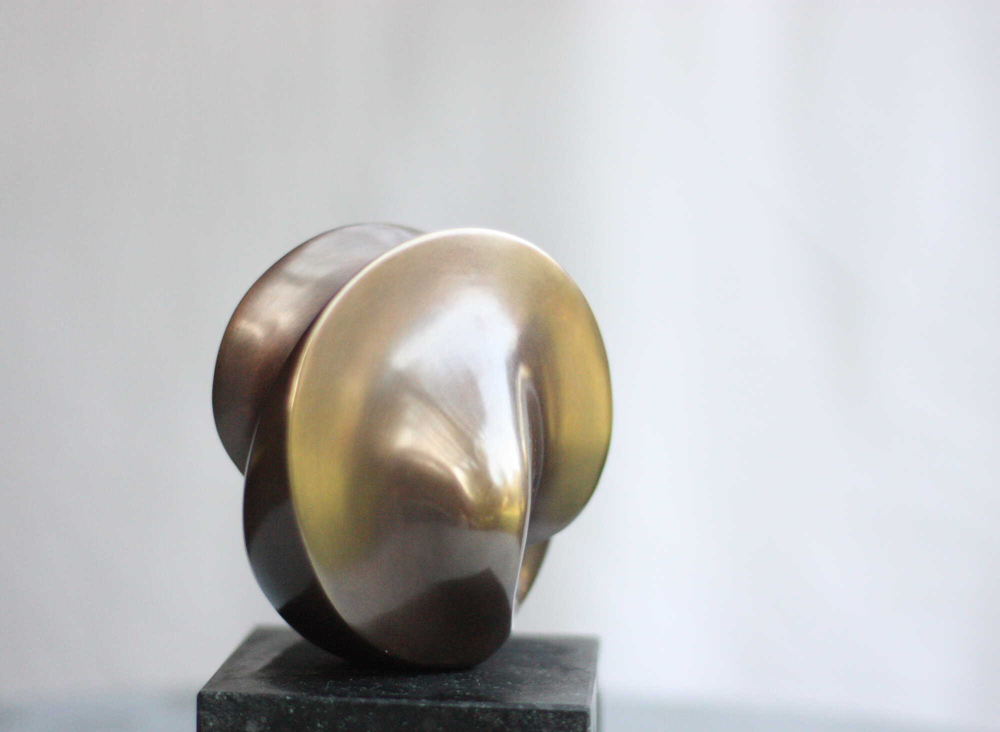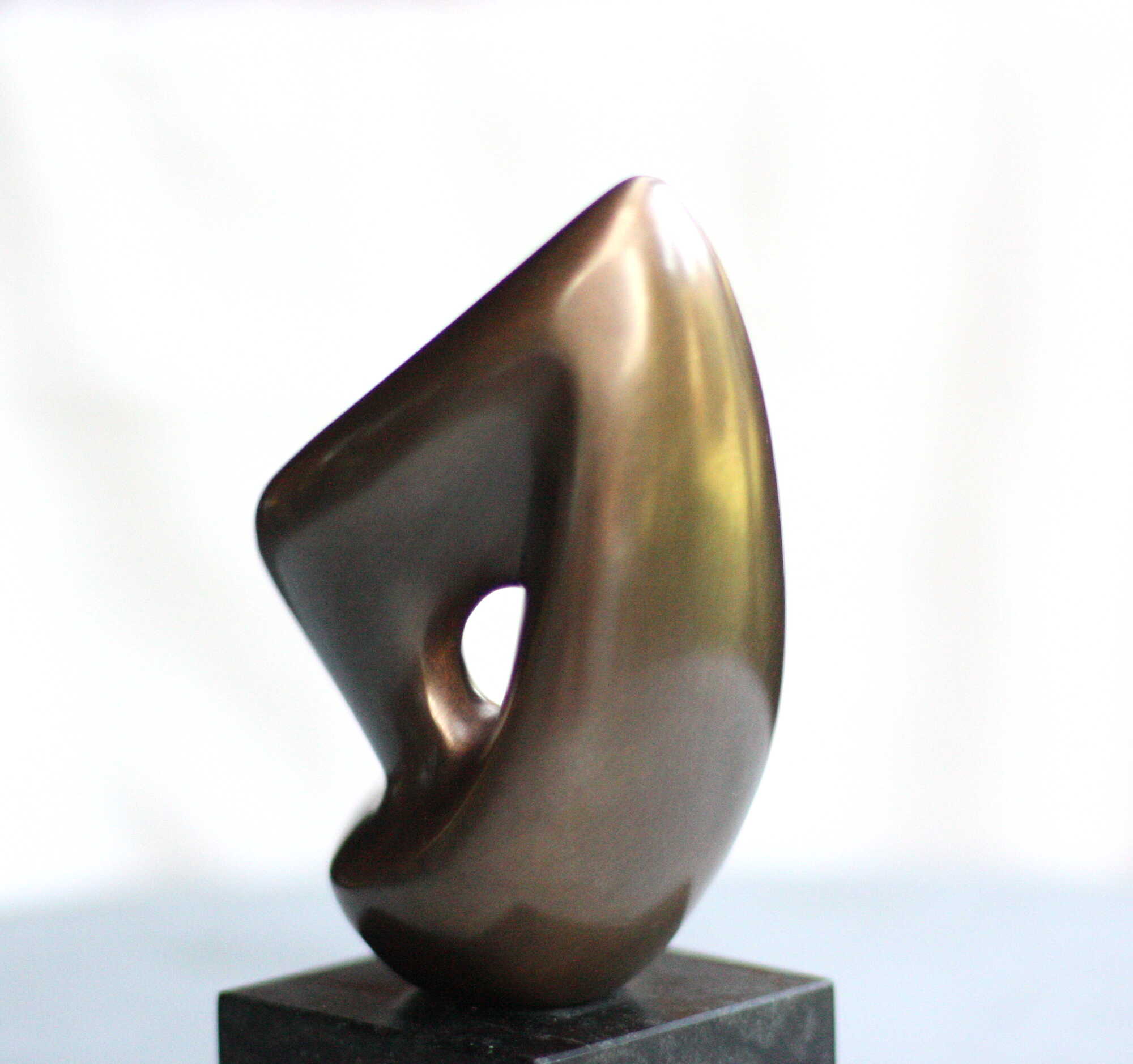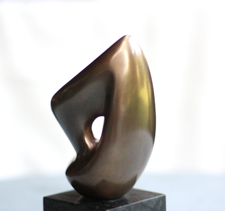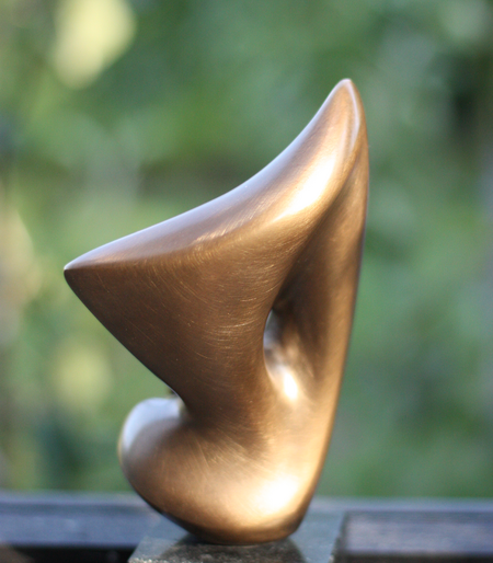 Die konzentriertere Version der Tanz-Form. Aus der kraftvollen Basis strebt die Spitze empor. Die Segel-artige Fülle verdeckt einen vergleichsweise großen Durchbruch, der je nach Standpunkt des Betrachters, auch Einblick in das Innere der Form gibt. Die Ausdruckskraft liegt nicht in ihrer Größe, sondern in der inneren Spannung. Das Spiel von Licht und Schatten auf der glatten durchgestalteten Oberfläche bezaubert.