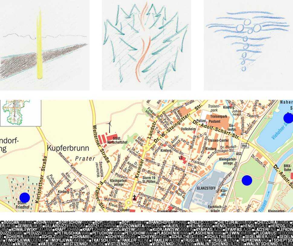 Namenstafel | Vor die rückseitige Hecke des Massengrabes am städtischen Friedhof wird in einigen Zentimetern Distanz eine rostende Stahlplatte aufgestellt. Sie ist etwas weniger hoch als die Hecke, leicht vom Boden abgehoben und mit ausgeschnittenen Namenszügen auf die ganze Länge des Grabfeldes versehen. Zur Gliederung der Namen wird das zugehörige Religionssymbol (Davidstern, Kreuz, Mondsichel) eingefügt sofern bekannt, ansonsten ein neutrales Quadrat.