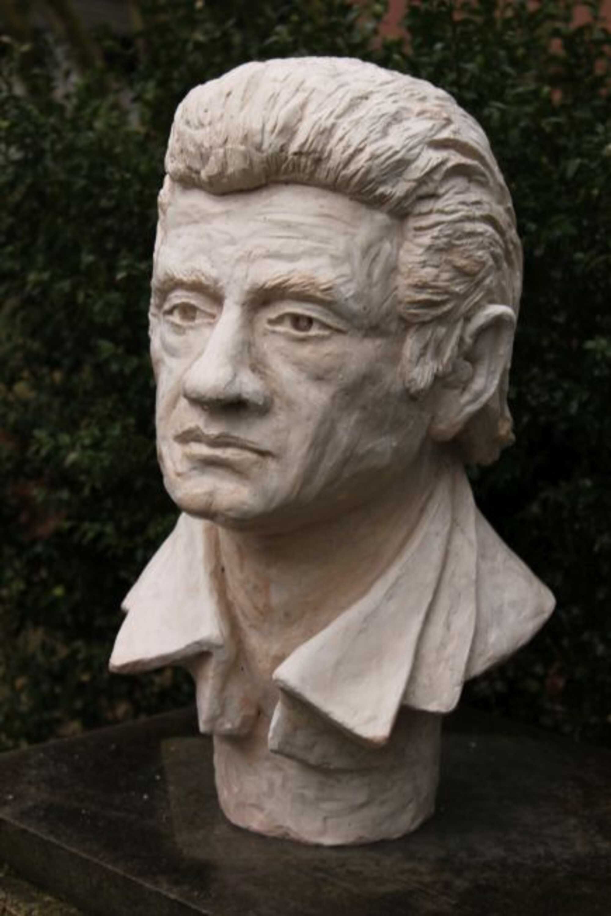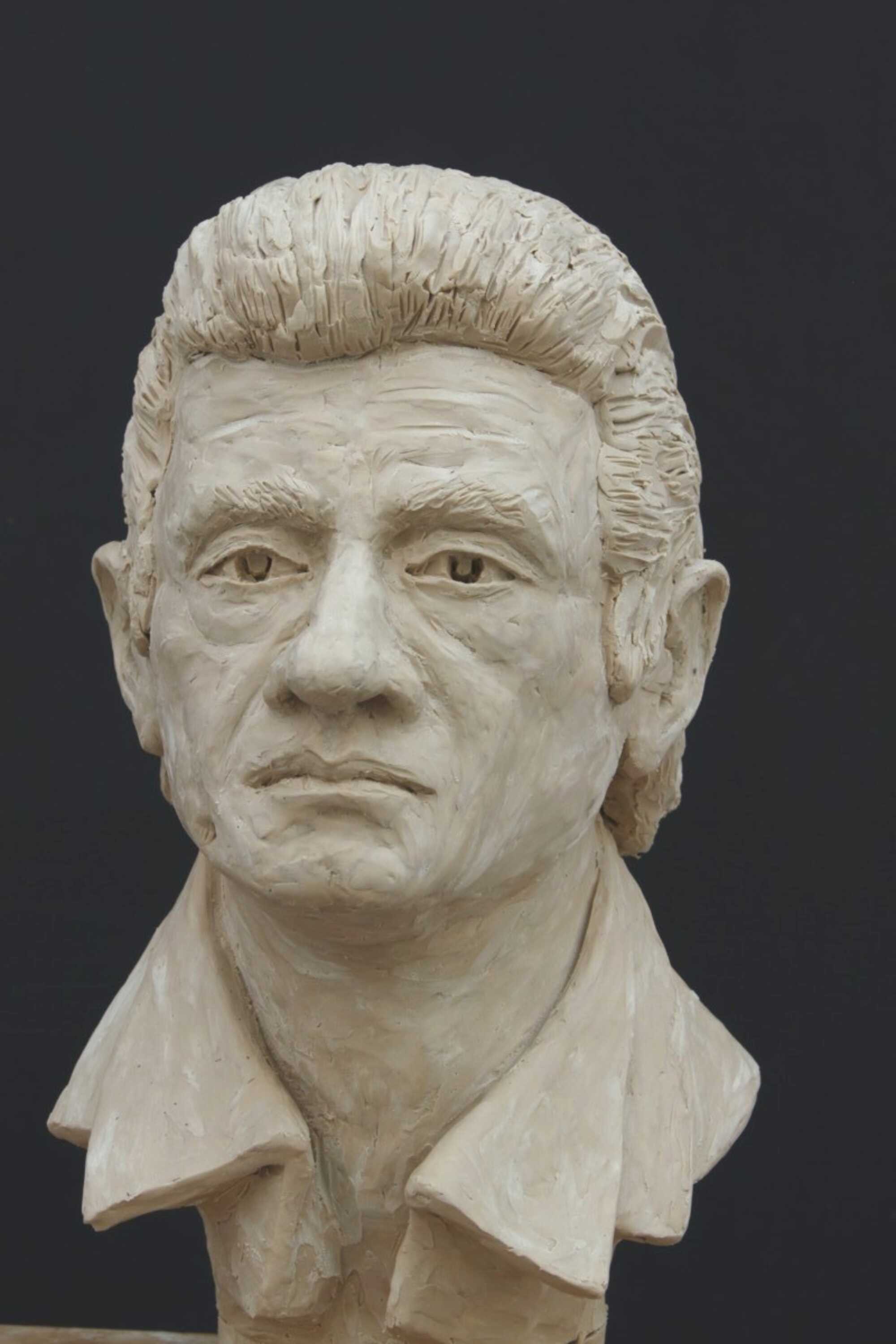 Portrait des Musikers Johnny Cash in Marmor, es zeigt ihn etwa im Jahr 1970