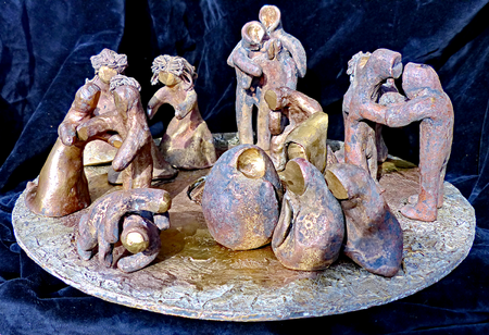 Four women in peaceful talk, next to them girls playing, boys fighting, a couple in love, men arguing, several advisors, a lonely thinker and a woman praying.
