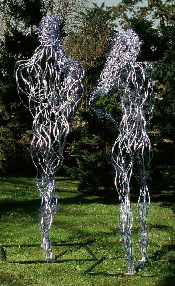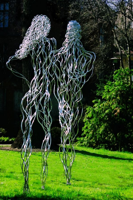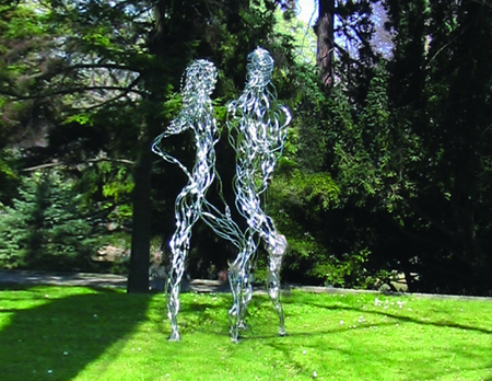Using various types and gauges of steel wire, the artist has created figures full of energy and whimsy. The sculpture might be likened to a line scribbled on paper, with a similar freedom of movement. There is the sense of immediacy as if the artist created the figures very quickly, allowing the lines of the wires to twist and turn as they wished. The artist wanted the figures to have real as well as visual movement. They have a “kinetic energy” that makes them seem to communicate with each other and with viewers.