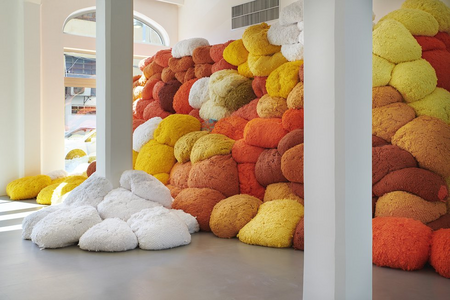 The solo exhibition features Hicks' distinctive installation of vibrantly colored sculptures in materials ranging from the traditional and natural, such as linen silk and cotton, to newly researched industrial materials based on advanced technologies.