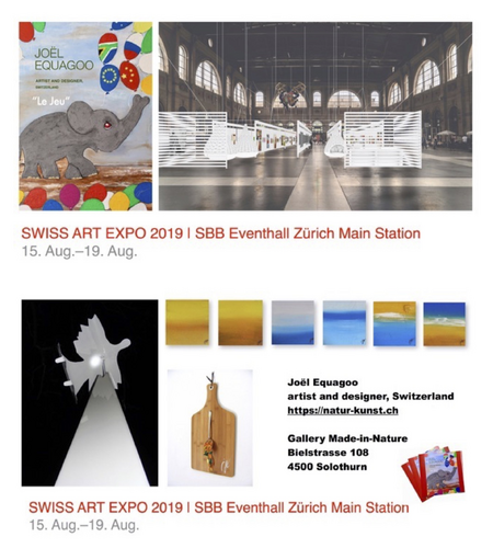 Invitation to my exhibition at the International SwissArtExpo 2019 in Zürich at the SBB Eventhall Zurich Main Station, from August 15 - 19, 2019. Hallo, I would love to invite you to visit my exhibition at the : International SwissArtExpo 2019 in Zürich at the SBB Eventhall Zurich Main Station, from August 15 - 19, 2019. I am looking forward to welcoming you and I thank you very much for your visit and I am wishing you a great time. Thanks for coming. kind regards, Joël Equagoo artist and designer, Switzerland https://natur-kunst.ch