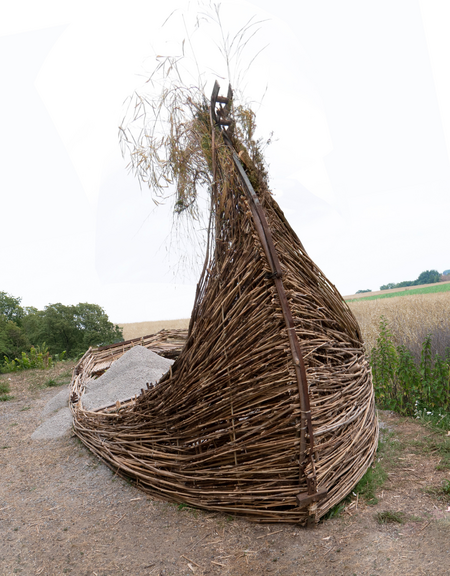 Chakal kreiert bevorzugt weltweit Schiffe und Boote, die er auf Felsen und Hügeln oder im offenen Gelände platziert. Für sein Artwork im Gelände des Alten Bahnhofs Neanderthal nutzt er geschnittenen Bambus, Eibenäste und rostigen Schrott alter Bahngleise. Materialien, die als Produkt der Garten- und Parkpflege normaler-weise auf einem Komposthaufen landen oder auf dem Schrottplatz vor sich hin rosten.
