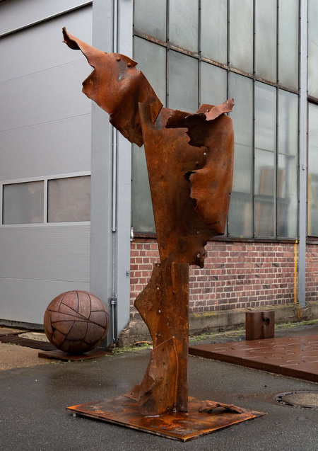 Wolf setzt sich seit Jahrzehnten mit der Bearbeitung von Stahl auseinander: ob Schweißbrenner, Hydraulikpresse oder Lasercut, er ist mit allen Techniken vertraut. Wenn er an seinen Skulpturen arbeitet, ist er mit vollem physischem Einsatz am Werk; er performt die Skulptur.